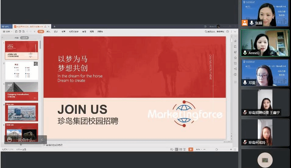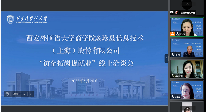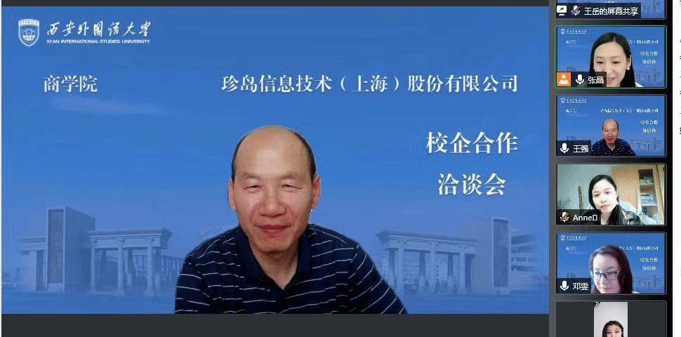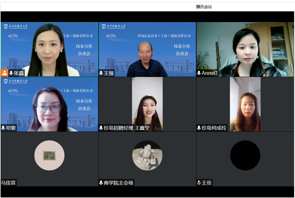 为落实教育部访企拓岗促就业专项行动和2022届高校毕业生就业促进周工作要求,进一步强化校企衔接、深化校企合作,有效推动毕业生就业工作,5月20日,商学院与珍岛信息技术(上海)股份有限公司(以下简称“珍岛集团”)举行“访企拓岗促就业”线上洽谈会。党委副书记王强出席会议,珍岛集团政委李勤、招聘经理王鑫宁、招聘主管何成玲,商学院党委书记邓雯、副书记兼副院长张晶,2022届毕业班辅导员马佳音、王岳参加此次活动。会议由张晶主持。