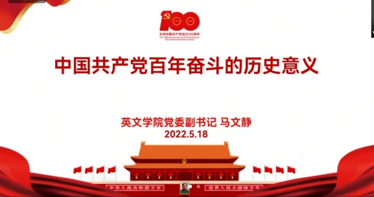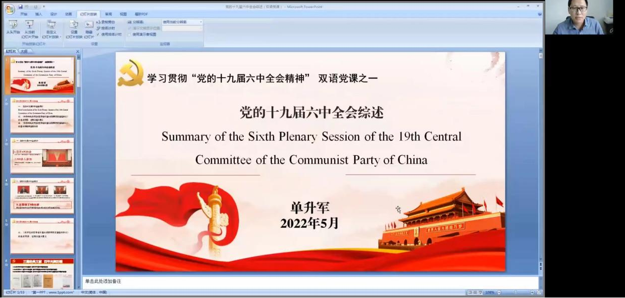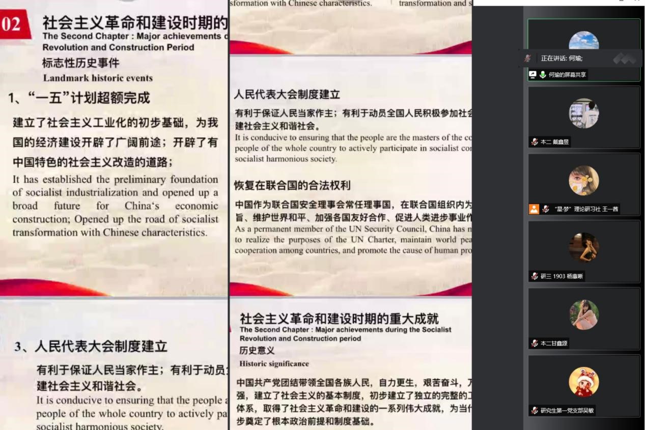 为深入学习贯彻党的十九届六中全会精神,英文学院党委结合英语专业特色,将时政热点与双语党课相结合,于5月中下旬举办了第五期“学习贯彻党的十九届六中全会精神”中英双语党课。本期党课采用线上教学方式,分为四场,每场均有300余名学生党员参加学习。