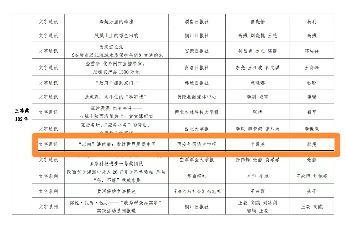 近日,2021年度陕西新闻奖评选结果揭晓。我校党委宣传部郭斐担任指导教师、新闻与传播学院2019级新闻学专业学生李孟尧撰写的文字通讯《“老内”潘维廉:看过世界 更爱中国》获得2021年度陕西新闻奖文字通讯类三等奖。这是我校首次在省内最权威的新闻奖评选中取得突破。