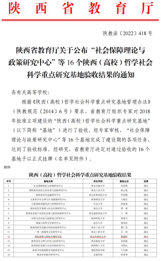 近日,陕西省教育厅印发了《关于公布“社会保障理论与政策研究中心”等16个陕西(高校)哲学社会科学重点研究基地验收结果的通知》(陕教函〔2022〕418号),依托我校建设的“国际舆情与国际传播研究院”达到验收标准,予以正式挂牌。这是我校第3个通过省教育厅验收的陕西(高校)哲学社会科学重点研究基地。