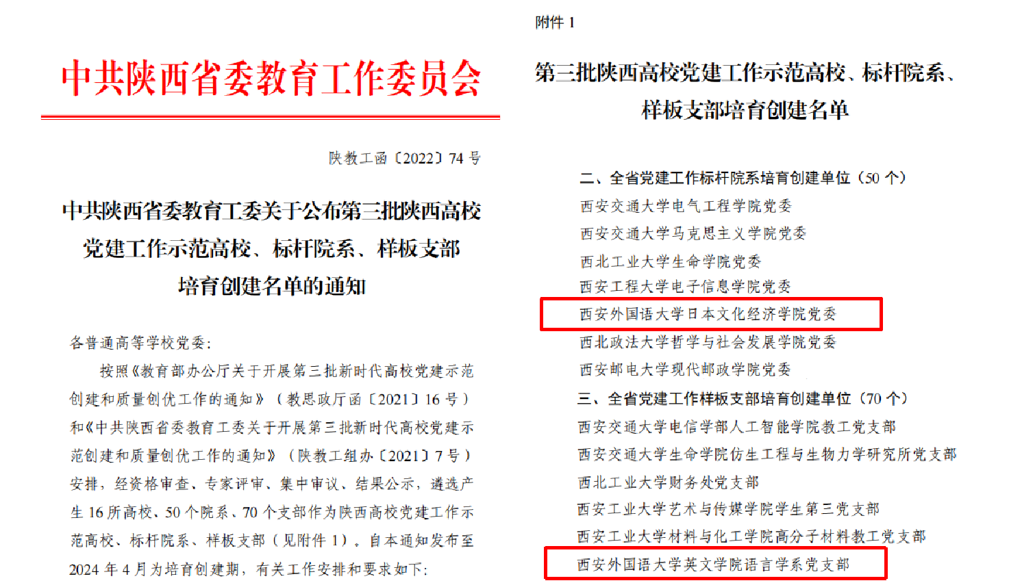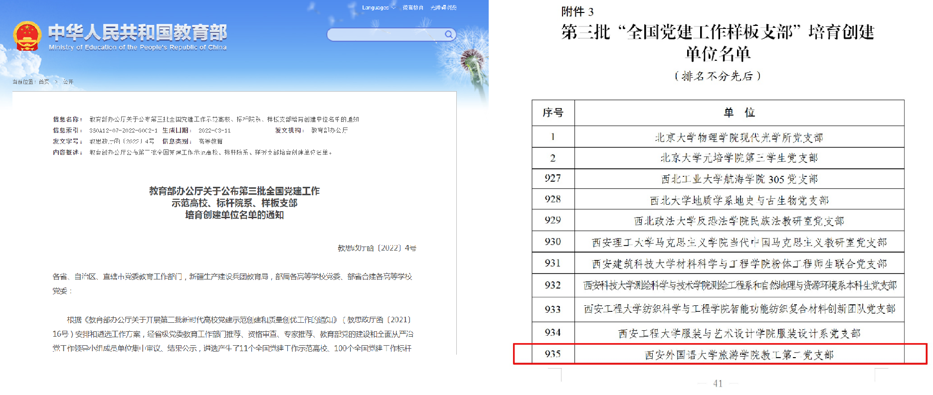 日前,教育部和省委教育工委公布了第三批新时代高校党建示范创建和质量创优工作评审结果,我校旅游学院教工第二党支部入选“全国党建工作样板支部”培育创建名单,日本文化经济学院入选“全省党建工作标杆院系”培育创建名单,英文学院语言学系党支部入选“全省党建工作样板支部”培育创建名单。