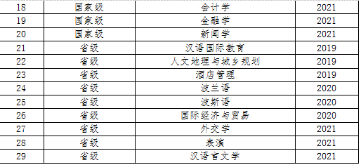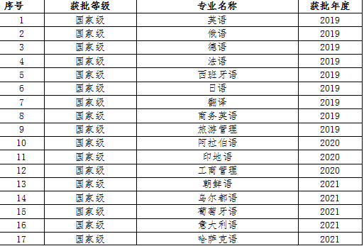 本次学校获批国家级一流专业建设点包括:朝鲜语、乌尔都语、葡萄牙语、意大利语、哈萨克语、会计学、金融学、新闻学等8个专业。获批的省级一流专业建设点包括:外交学、表演、汉语言文学等3个专业。至此,学校共获批20个国家级一流本科专业建设点,9个省级一流本科专业建设点,在全部在招本科专业中的覆盖率达到50%,实现一流本科专业建设点所在学院全覆盖。