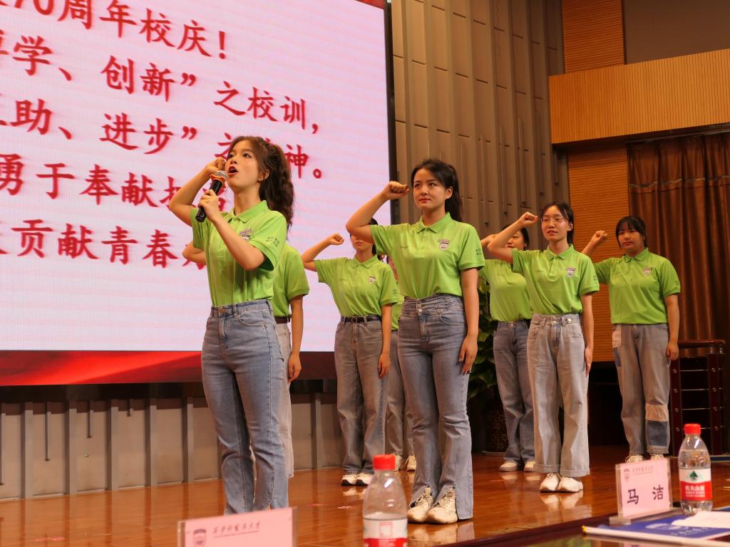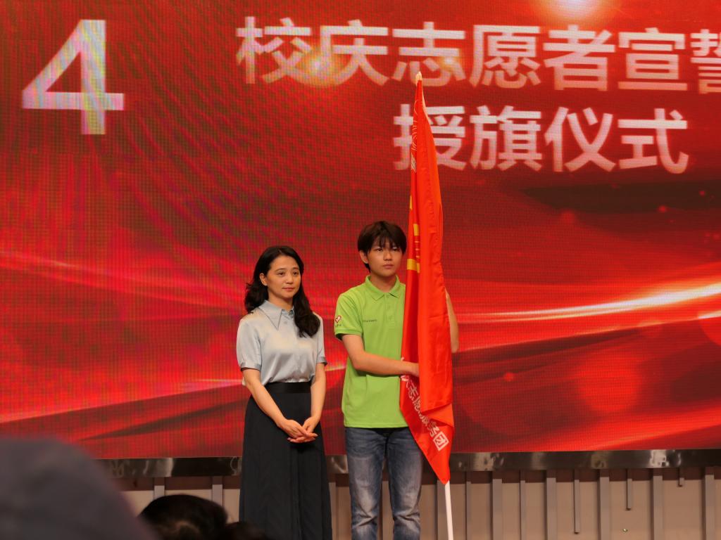 党委副书记马洁为校庆志愿者授旗。