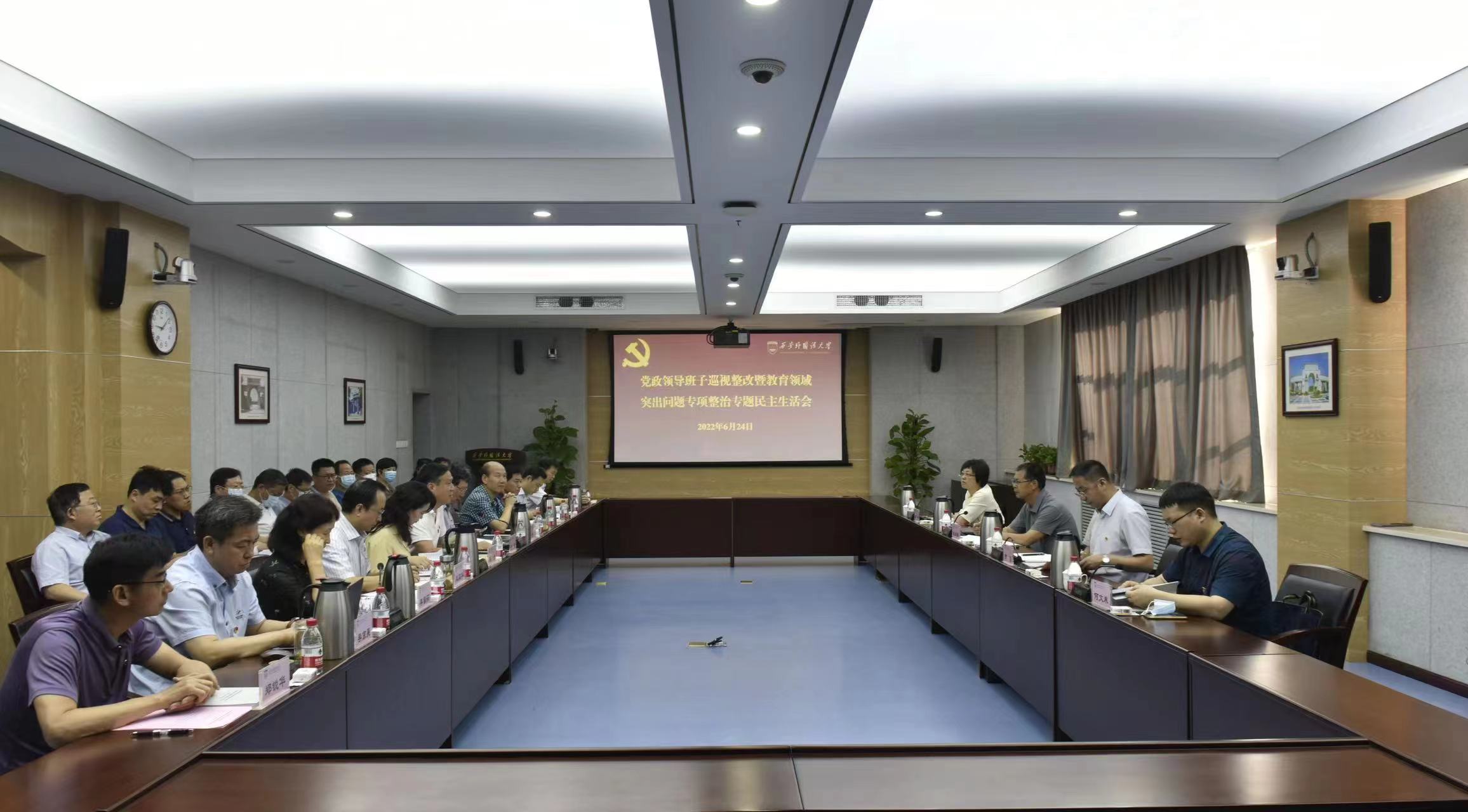 6月24日上午,我校在长安校区召开校级党政领导班子巡视整改暨教育领域突出问题专项整治专题民主生活会。专题民主生活会指导组组长、省教育厅副厅长赵昶葆,指导组成员陕西省教育厅高教处处长高强,基教一处处长李臻,研究生处副处长何文来一行4人到会指导。会议由党委书记白黎主持。学校党政领导班子成员参加会议,相关职能部门及学院党政负责人代表列席会议。
