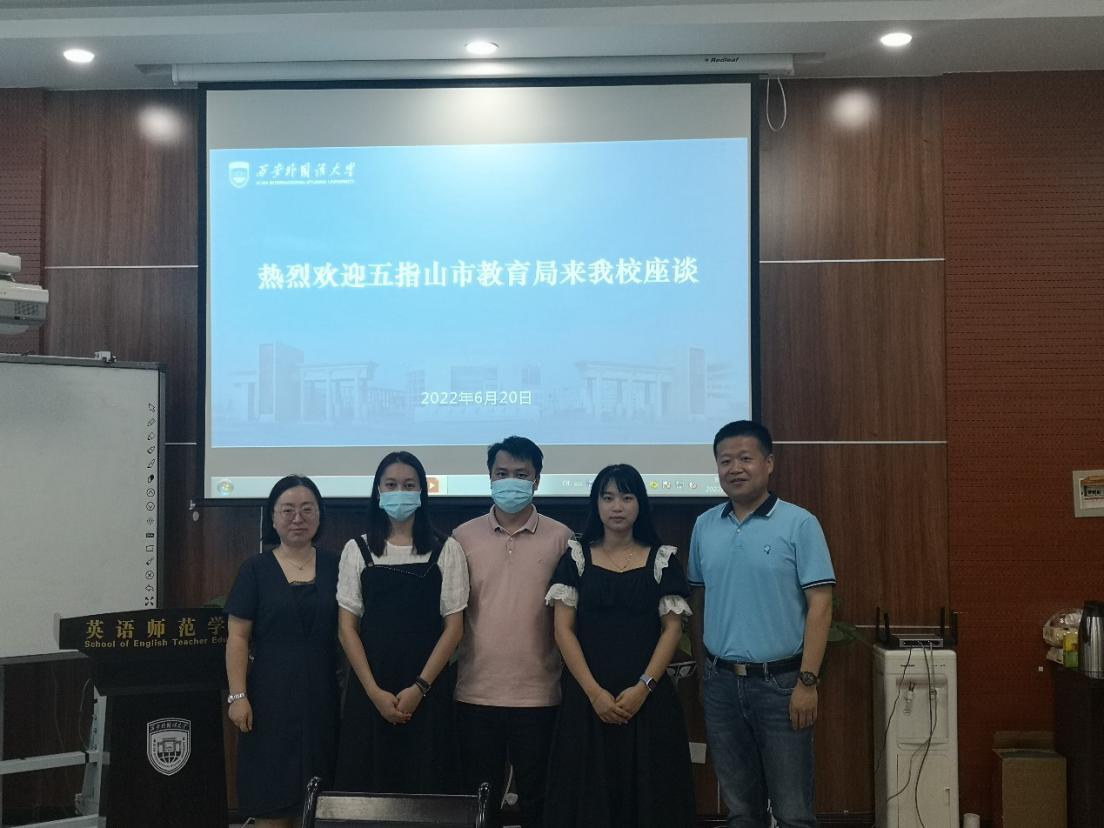 近日,海南省五指山市教育局一行来我校洽谈教师招聘及校际合作事宜。会前,学工部部长丁铭、英语师范学院·教育学院院长孙二军与五指山市教育局一行进行了亲切交流。学工部学生就业指导中心程成、英语师范学院·教育学院党委副书记刘一静、研究生辅导员薛璐、中国语言文学学院辅导员张萌、旅游学院辅导员胡森文及部分学生代表参加了座谈交流。