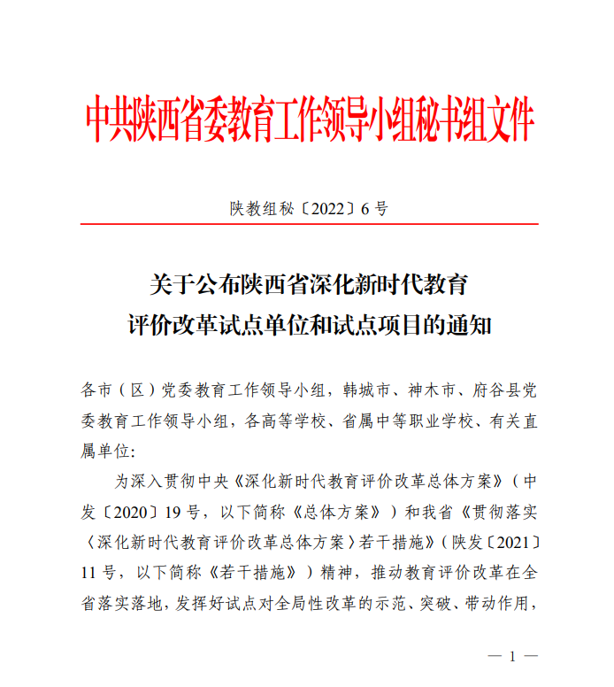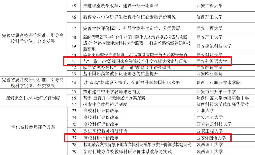 近日,中共陕西省委教育工作领导小组秘书组印发《关于公布陕西省深化新时代教育评价改革试点单位和试点项目的通知》。经自主申报、各地推荐、省委教育工委省教育厅业务审核和公示,确定各市(区)县、高等院校、省属中等职业学校、有关直属单位的160个项目获批陕西省深化新时代教育评价改革试点项目,我校“与‘一带一路’沿线国家高等院校合作交流模式探索与研究”和“高校科研评价改革”项目入选。