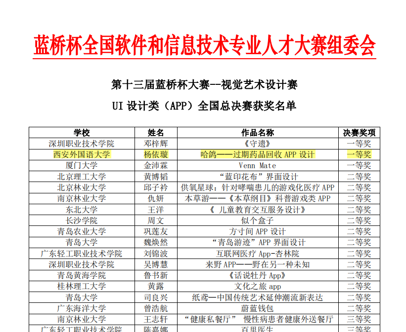 6月29日,第十三届蓝桥杯(教育部中国高等教育学会大学生竞赛榜单)大赛视觉艺术设计赛全国总决赛公布结果。经过校、省、国家、初赛、决赛层层选拔,我校艺术学院李金明老师指导的2019级动画专业学生杨依璇作品《哈鸽》获得国家级一等奖,全国排名第二。这是动画专业继2021年中国大学生计算机大赛获得国赛一等奖后的又一突破。