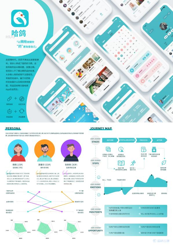 “哈鸽”APP,以“抗疫+环保”为出发点,解决人们对于过期药品的处理问题——回收代替浪费。APP基于对药物的信息展示,相关禁用搭配、用药提醒、药品回收等,健康、养生、保健、科学、环保。疫情暴发的三年中,大众外出少,买药不再像从前那般便利,特别是特殊药物。因此,大家都养成了囤药的习惯,导致药品闲置、放置过期等问题出现。居民对药品有效期的关注程度不高,尤其在家庭单位中,成员对于过期药品回收知晓率和参与度较低。大家对过期药物产生的危害认识不全面,它不仅会污染土地和水资源,严重者还可能破坏生态食物链,且具有挥发性的过期药物,还可能会成为过敏源。