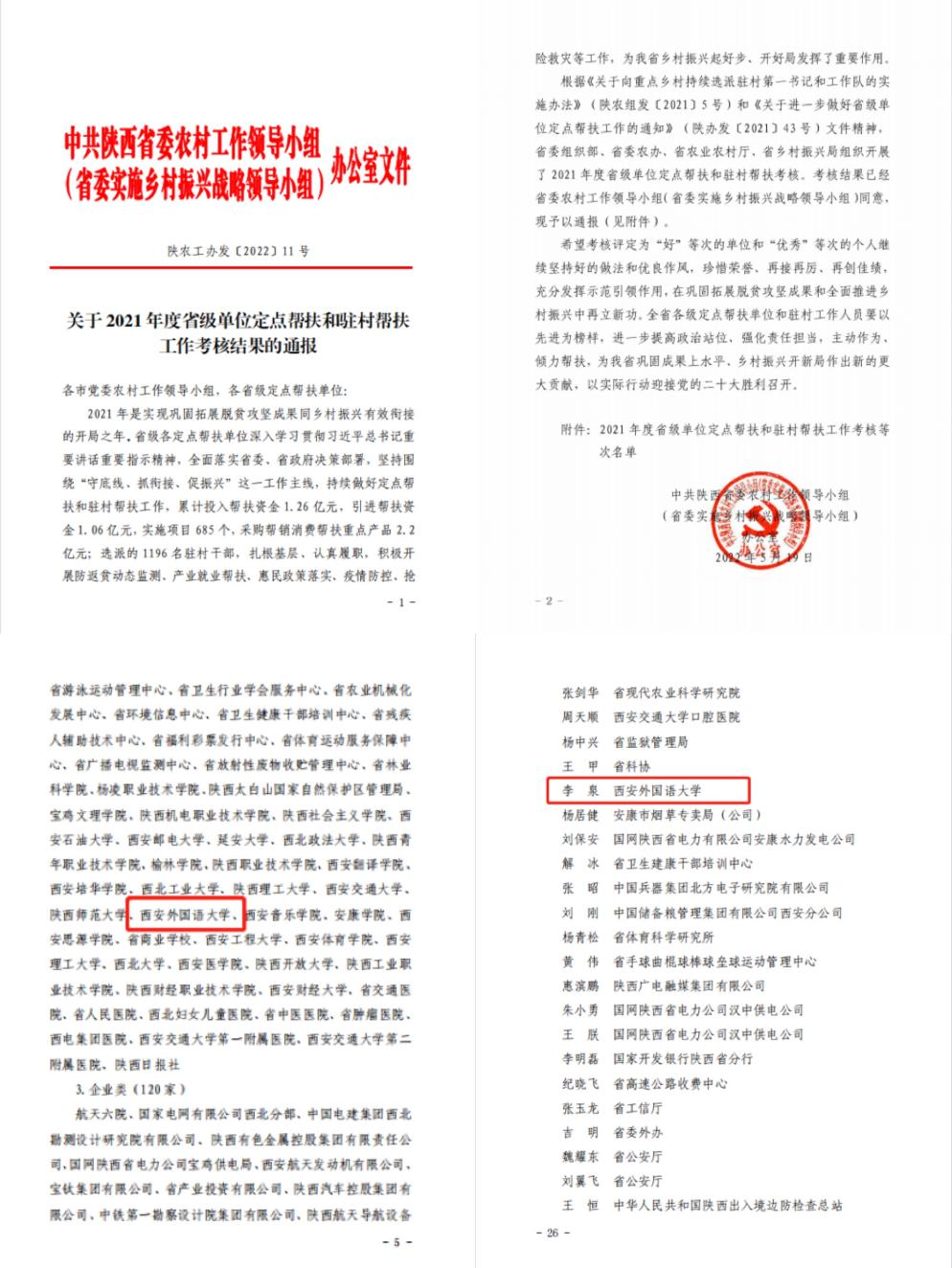 近日,中共陕西省委农村工作领导小组(省委实施乡村振兴战略领导小组)办公室印发《关于2021年度省级单位定点帮扶和驻村帮扶工作考核结果的通报》(陕农工办发〔2022〕11号),我校在省级单位定点帮扶考核工作中获评“好”等次,驻村工作队员李泉获评“优秀”等次省级定点帮扶单位工作队员。