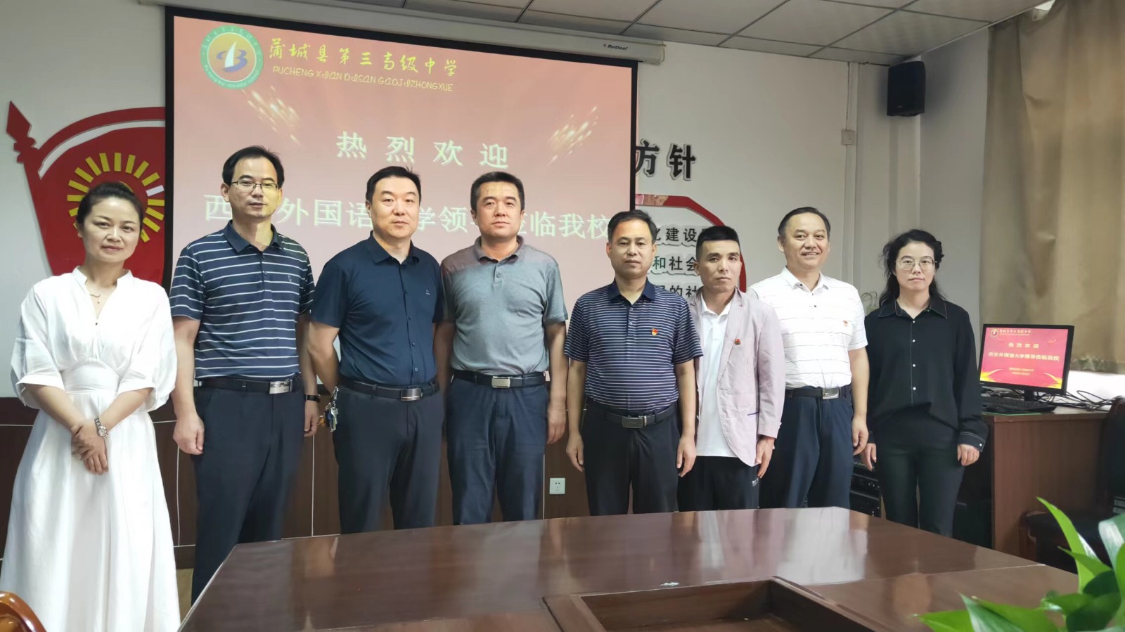 7月21日,王刚书记一行到达白水中学,受到白水县副县长姚明亮、白水中学校长李龙康的热烈欢迎。李龙康介绍了学校基本概况、教师师资建设、学校教学质量和人才招聘等情况。王刚介绍了学院人才培养体系和毕业生就业工作情况,并指出白水中学办学特色明显,发展潜力较大,希望未来可以加强与白水中学的合作,发挥各自优势,促进共同发展。姚明亮表示白水县文化资源丰富,高度重视基础教育发展,希望加强与西外合作,充分发挥西外资源优势,促进白水县教育和文化事业发展。
