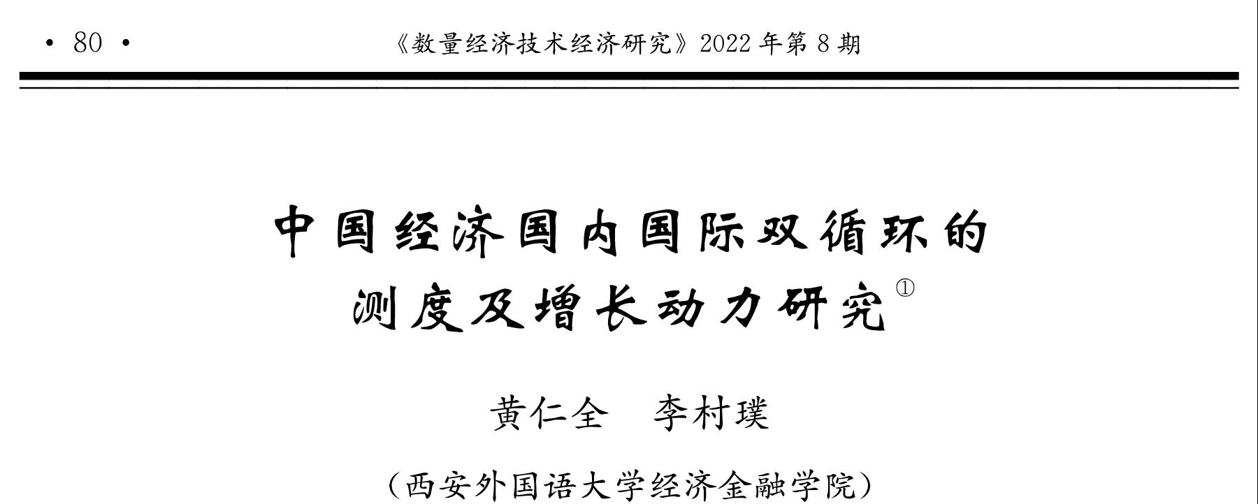 近日,我校经济金融学院黄仁全副教授和李村璞教授合作完成的学术论文《中国经济国内国际双循环的测度及增长动力研究》,在经济学和管理学权威期刊《数量经济技术经济研究》2022年第8期正式刊出。该文是我校深入贯彻新发展理念主动融入新发展格局相关研究的阶段性成果,也是献给建校70周年校庆的学术礼物,更是经济金融学院成立10年来首次在经济学权威期刊取得的突破性进展。