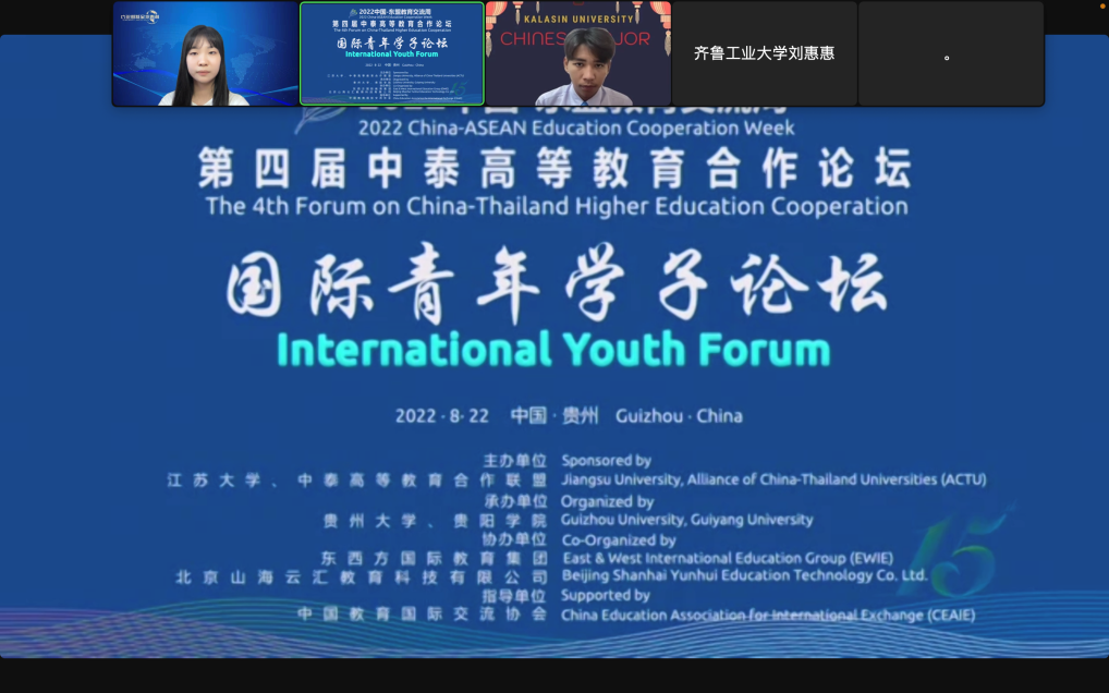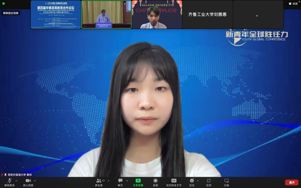 8月22日下午,由江苏大学、贵州大学、中泰高等教育合作联盟共同主办的“第四届中泰高等教育合作论坛”之“国际青年学子分论坛”在贵州举行。我校卓越创新学院教师、学生代表获邀线上出席论坛,新闻与传播学院21级卓越班黄玥在论坛上做了题为“语言学习助推区域合作与共同发展”的主旨发言。