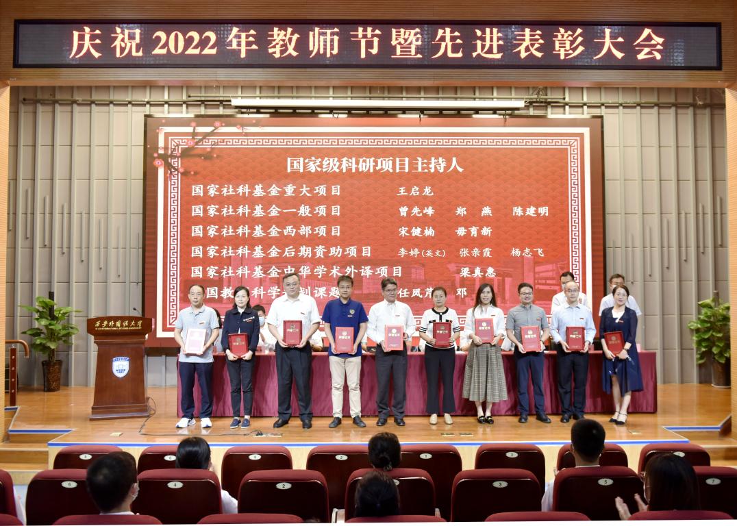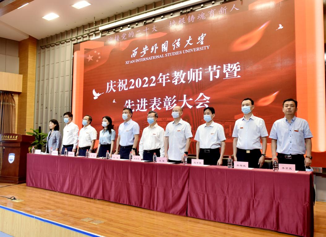 终南山下桂香飘,中秋喜迎教师节,西外校园花正好,七秩芳华谱新篇。9月9日下午,学校在长安校区JA111报告厅召开庆祝2022年教师节暨先进表彰大会。全体校领导、新入职员工代表、获奖教职工代表等参加大会。各单位、各部门设立分会场观看会议直播。大会主题是“喜迎党的二十大,培根铸魂育新人”,集中展示了学校全面贯彻落实习近平新时代中国特色社会主义思想,落实立德树人根本任务的进展成效,展现全校教职员工不懈拼搏、昂扬向上的奋斗精神,表彰在师德师风、科研、教学、育人等方面做出突出成绩的优秀教职工。会议由副校长李雪茹主持。