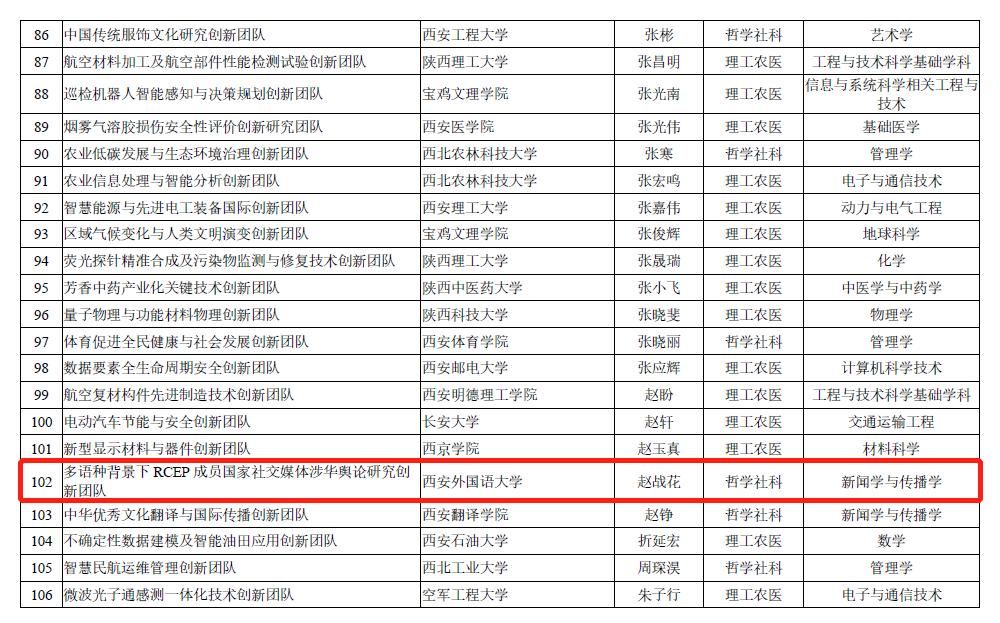 近日,陕西省教育厅发布《关于公布2022年度陕西高校青年创新团队入选名单的通知》,我校新闻与传播学院赵战花教授负责的“多语种背景下RCEP(区域全面经济伙伴关系协定)成员国家社交媒体涉华舆论研究创新团队”入选2022年度陕西高校青年创新团队,这是我校自2020年以来第三支团队入选该项目。