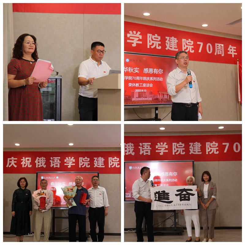 黄达远院长在致辞中指出,学院的今天离不开各位前辈学者的拓荒之功,感谢他们艰苦创业、奋力开拓俄语教育事业,成为俄语专业的重镇;目前学院发展势头良好,从单一俄语发展到五种欧亚语言;现有俄语和哈语两个国家一流本科专业建设点,形成了本、硕、博和博士后的完整人才培养体系。学院正在转型发展的关键时期,学科建设势头向好。俄语学院的生命之树一定会常青,祝福前辈师长健康长寿。退休教师李梅芳为院庆70周年题赠了“奋进”的书法作品。赵红教授朗诵了校友们为母校院庆发来的贺诗。