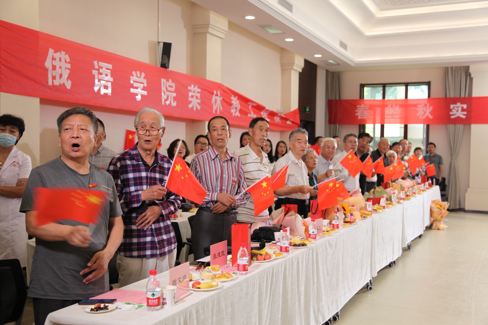 全体在职教职工为荣休教职工合唱《感恩的心》,表达对前辈们的致敬和感恩之心。最后一个环节,三代俄语人集体起立,国旗飞舞,合唱《歌唱祖国》,不忘为党育人、为国育才的初心使命,将现场气氛推向高潮。