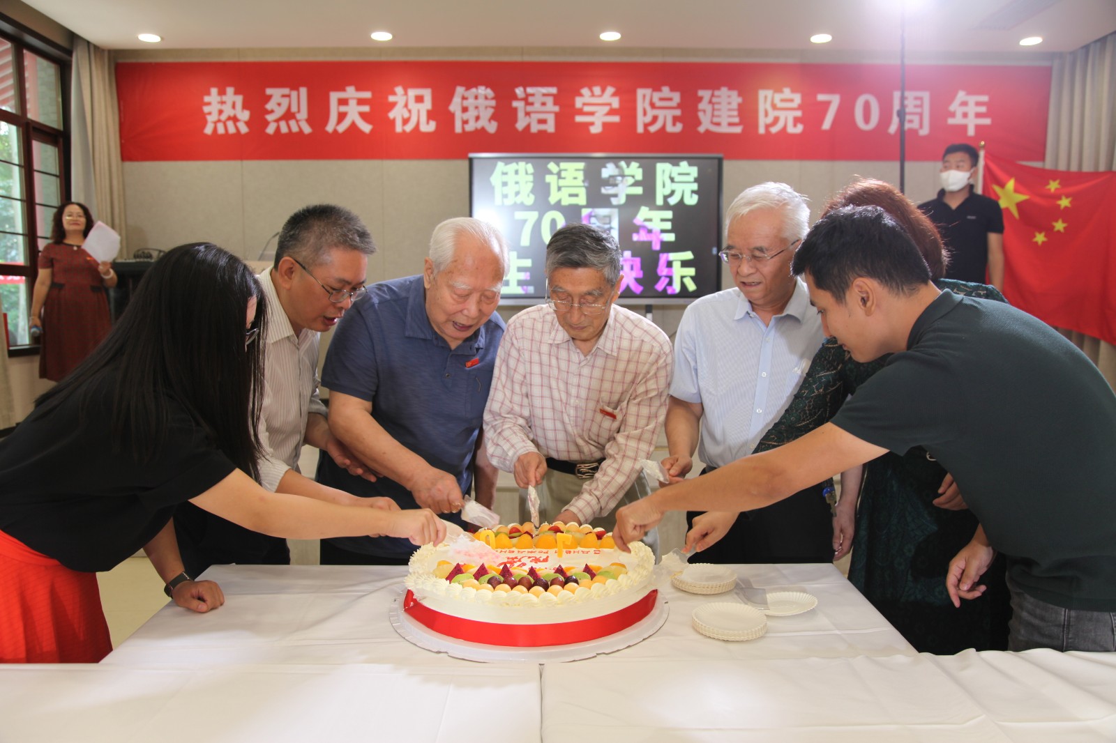 在职教师代表给孙汝林、沈友泰、胡棣华、何玉英、阎合德、隋长华、屈瑞、杨清海、王仰正、褚凤林等参会前辈师长赠送鲜花表达敬意。黄达远为荣休教职工赠送院庆纪念品。孙汝林教授、沈友泰教授等为院庆70周年的生日蛋糕点燃蜡烛,切分蛋糕,同祝俄语学院“生日快乐”!