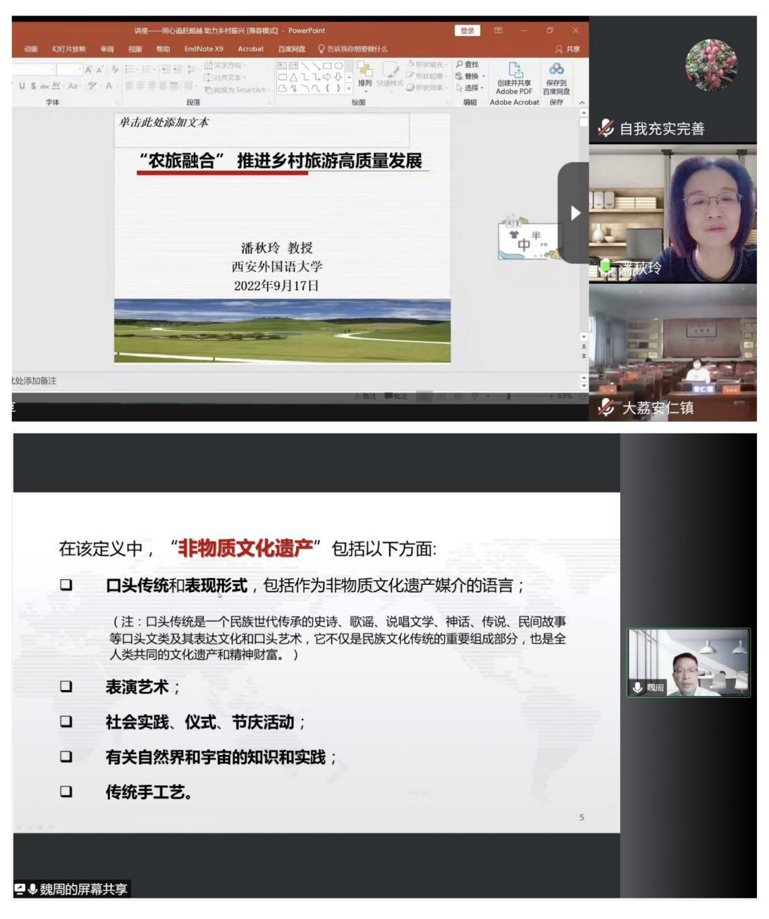 讲座上,西安市雁塔区政协委员、致公党西外主委、校学科建设办公室主任潘秋玲聚焦“高质量发展背景下农旅融合发展模式和对策”主题,从“背景-高质量发展”“回顾-历史与问题”“案例-国内与国外”“趋势-发展方向”四个模块,通过生动的案例分享了乡村振兴工作中的成功经验做法。她指出,从事乡村振兴事业的主体人员要主动把握国家重大政策指向,将三农问题、新型城镇化和乡村振兴目标有机结合,结合旅游发展新理念,推进农旅产品升级转型,积极培育新业态,持续推动农旅融合高质量发展。校欧美同学会会员、英文学院教师魏周从“新时期非物质文化遗产的保护与传承”展开阐述,通过对保护与传承非遗的重要意义、常见误区、基本模式与措施等方面分析了“非遗+教育”“非遗+文旅农”“非遗+数字技术”等可行性路径措施。