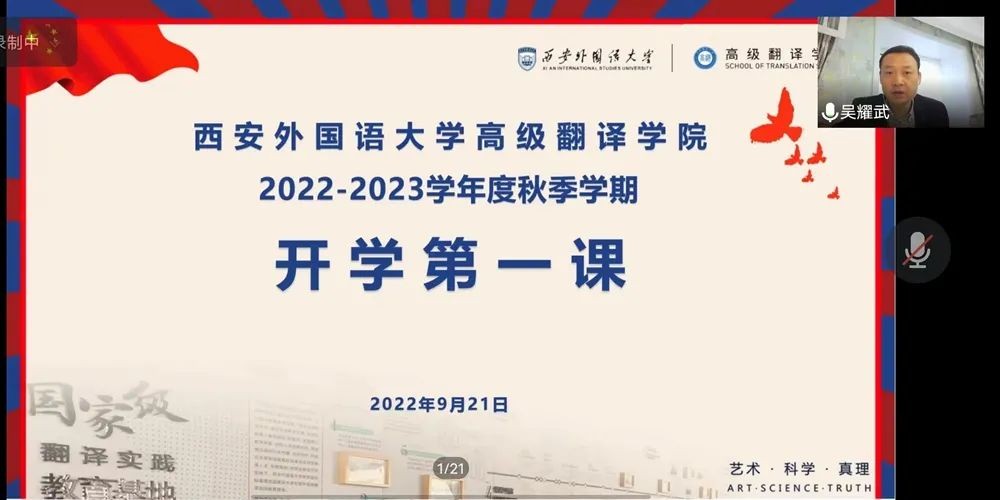 9月21日,高级翻译学院线上举办“开学第一课”。副校长吴耀武应邀担任主讲。高级翻译学院2022级全体学生聆听课程。