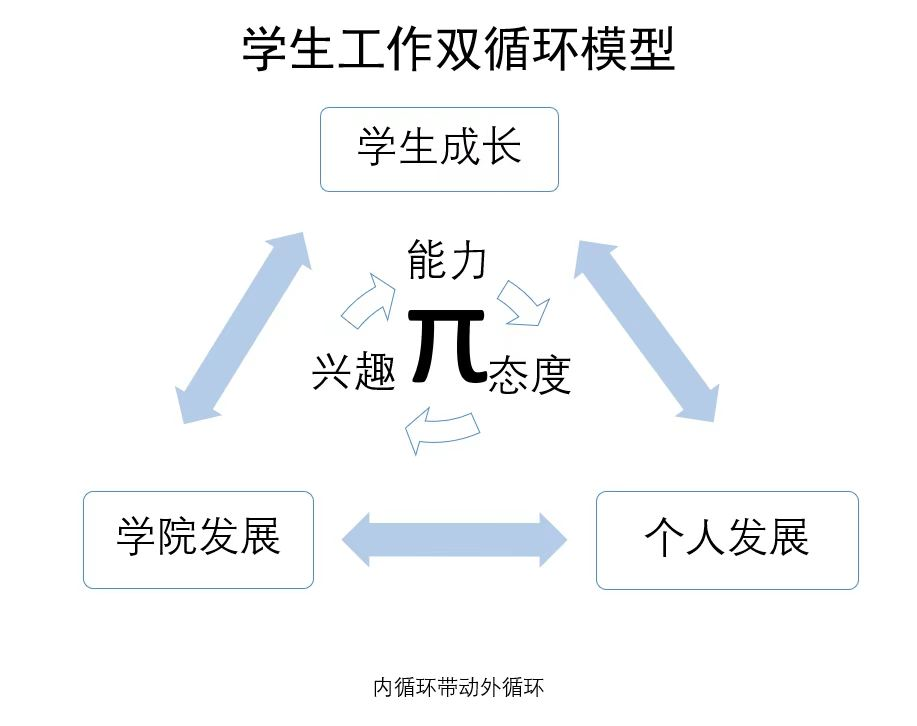 ——齐心协力,做强一支队伍。高素质的学工干部队伍是培养德才兼备时代新人的核心力量。学院坚持“有要求、有标准、有支持”的培养机制,全力打造一支站位有高度、思想有深度、工作有力度、做事有温度的学工队伍。学院注重打造学生活动品牌、强化学生队伍建设与助力辅导员专业成长融合发展,根据辅导员个人研究方向和优势特长,将学院学生工作进行精细化分解、精准化分管,在实践中探索出学生工作“双循环”模型(如图所示)。通过提升职业能力、培养专业兴趣、转变工作态度,让辅导员内生动力的循环促进个人成长;辅导员通过提升个人职业素养更好地引领学生成长,推动学院高质量发展,打造出有“通用能力+专业能力+工作热情”的“π”型学工队伍,构建学生(Students)、学工队伍(Staff)、学院(School)共同成长的3S一体化育人格局。