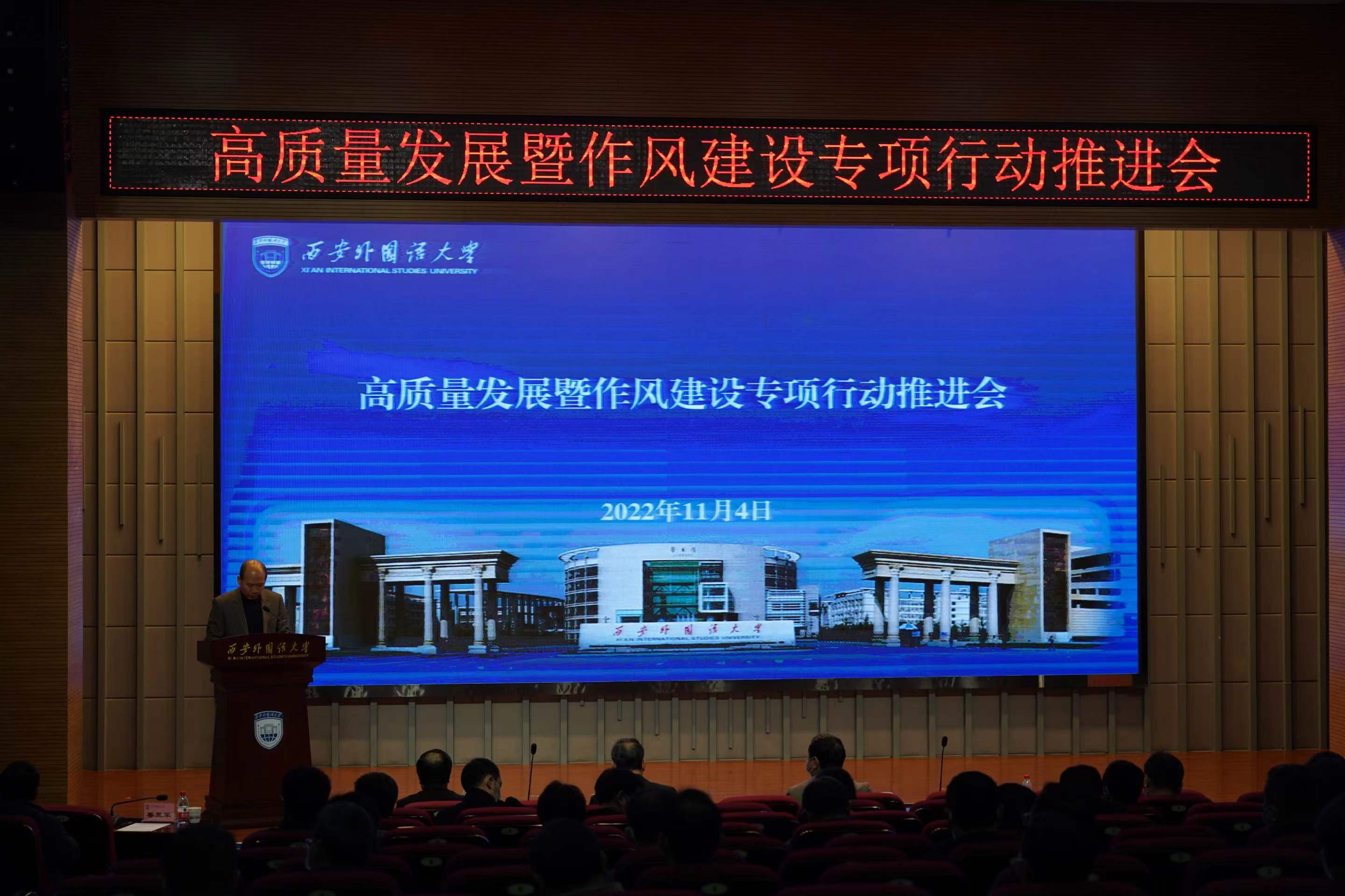 11月4日上午,学校在长安校区JA111采取线上线下相结合的方式召开高质量发展暨作风建设专项行动推进会。全体在校校领导、各单位、各部门党政负责人出席会议,其他处级干部通过移动终端收看。会议由党委副书记、纪委书记、监察专员王强主持。
