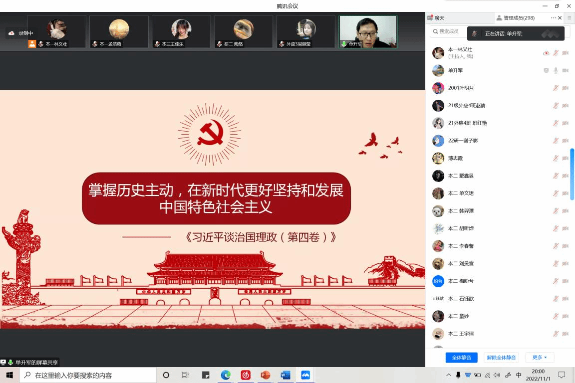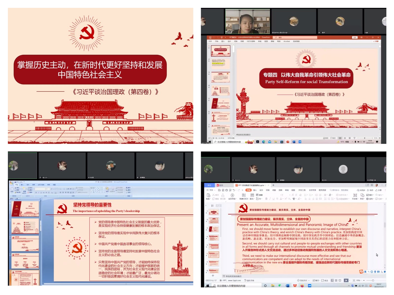11月1日和3日,英文学院举办第6期中英双语党课,深入学习《习近平谈治国理政》第四卷。本期党课采取线上培训方式,共分为“以伟大自我革命引领伟大社会革命”“掌握历史主动,在新时代更好得坚持和发展中国社会主义”“推进社会主义文化强国建设”“坚持党的全面领导”四讲,学院300余名学生党员参加。