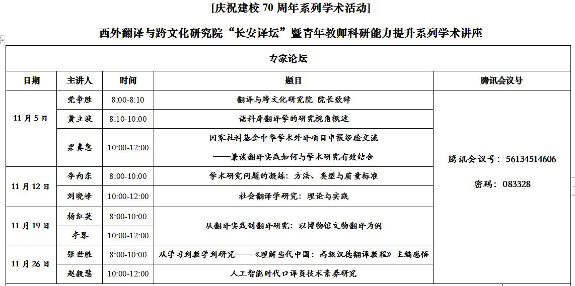 11月5日,为庆祝建校70周年,我校翻译与跨文化研究院、科研处•科研机构管理中心采用线上方式,顺利举办“长安译坛”暨青年教师科研能力提升系列学术活动首场专家论坛。论坛由高级翻译学院李琴教授主持。