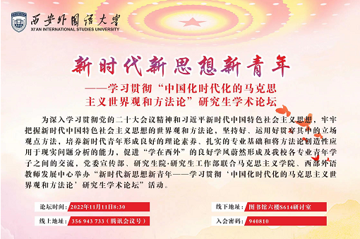 为深入学习贯彻党的二十大精神和习近平新时代中国特色社会主义思想,党委宣传部、研究生院·研究生工作部、科研处联合马克思主义学院、西部外语教师发展中心于11月11日上午共同举办“新时代新思想新青年——学习贯彻‘中国化时代化的马克思主义世界观和方法论’研究生学术论坛”活动,本次活动在线上线下同步进行。副校长李雪茹出席活动,来自旅游学院、马克思主义学院、新闻与传播学院、商学院、英文学院的师生50余人参加了现场论坛。活动由研究生院副院长王仁锋主持。