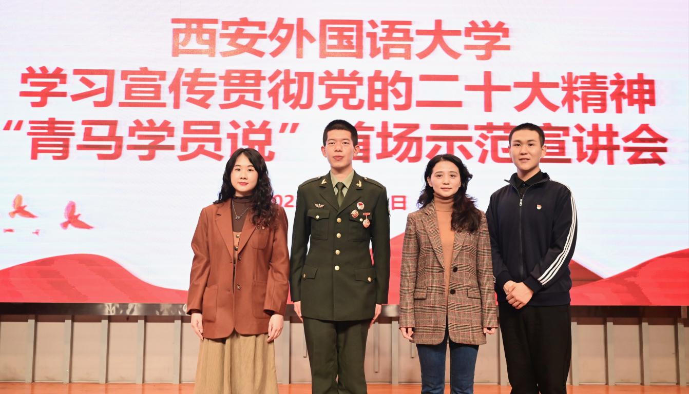 活动在学校大学生艺术团同学们热情洋溢的配乐诗朗诵《请党放心,强国有我》中拉开序幕。“青马工程”优秀学员代表、欧洲学院2019级德语专业学生唐珂燚围绕“语言融通世界,讲好中国故事”,探讨了外语专业学生如何努力培养扎实过硬的外语运用能力,使自己成为能用外语讲好中国故事、传播中国文化的时代新人;新闻与传播学院2019级播音与主持艺术专业学生杜文玺讲述“以青春之我耀梦想之光”,分享了自己参加十四运会和残特奥会演出的经历;经济金融学院2019级金融学专业学生王楚天以“雪山回荡英雄气使命感召青年行”为题,分享了自己在大学参军入伍期间的所见所闻及成长感悟。三位同学结合自我成长经历谈了学习党的二十大精神的心得体会,宣讲主题突出,内容生动活泼,感人至深。