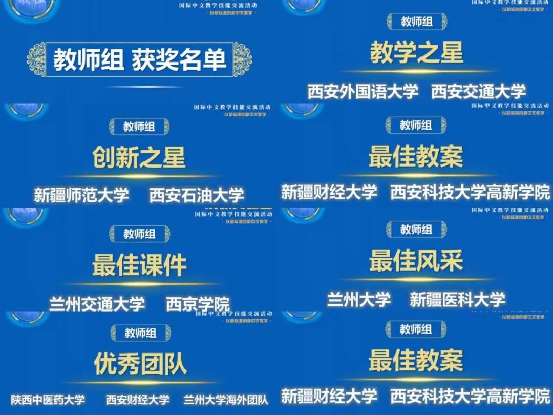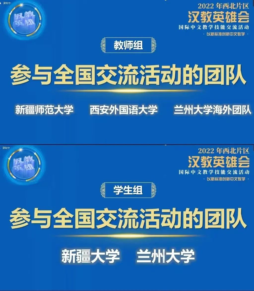 11月12日,由全国汉语国际教育专业学位研究生教育指导委员会、教育部中外语言交流合作中心主办,西北师范大学承办的2022“汉教英雄会”国际中文教学技能(西北片区)交流活动以线上的方式成功举办。本次交流活动主题为“以新标准创新中文教学”,来自陕西省、甘肃省、新疆维吾尔自治区的19所院校,24支师生团队参加。