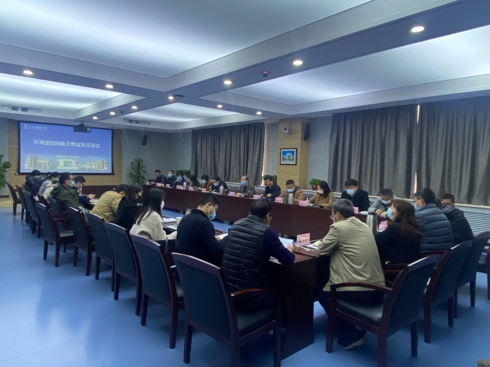 为深入学习贯彻党的二十大精神,推进作风建设专项行动走深走实,11月18日学校在长安校区行政楼B304会议室召开作风建设问政会暨意见反馈会,党委副书记、纪委书记、监察专员王强出席会议并讲话。党委办公室·校长办公室、学工部、人事处、教务处、科研处、研究生院·研究生工作部、财务处、教育产业发展中心、保卫处、基建处、后勤管理处、图书馆、信息化处和校医院等管理服务部门负责人,以及二级学院师生代表近50人参加会议。会议由党委委员、组织部部长赵沛主持。