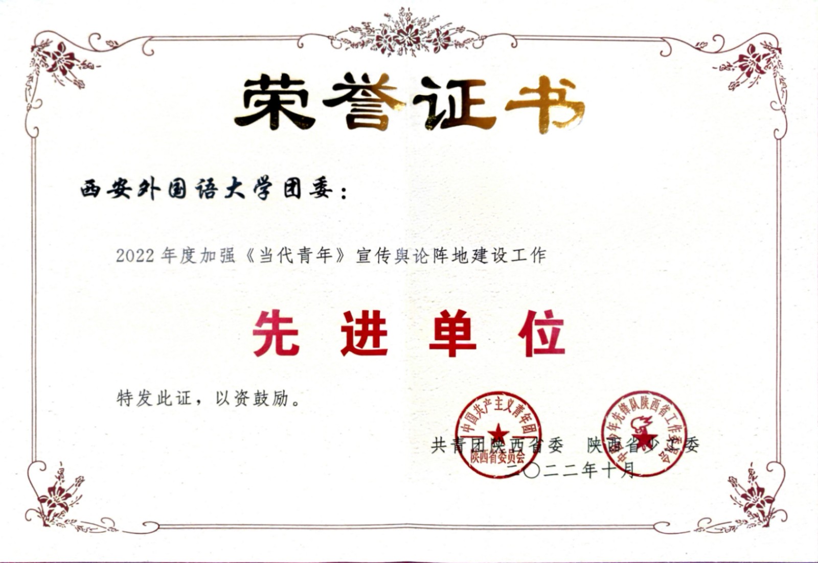 日前,我校团委积极响应共青团陕西省委员会号召,组织参与加强《当代青年》杂志宣传舆论阵地建设工作,获评该项工作“先进单位”称号。