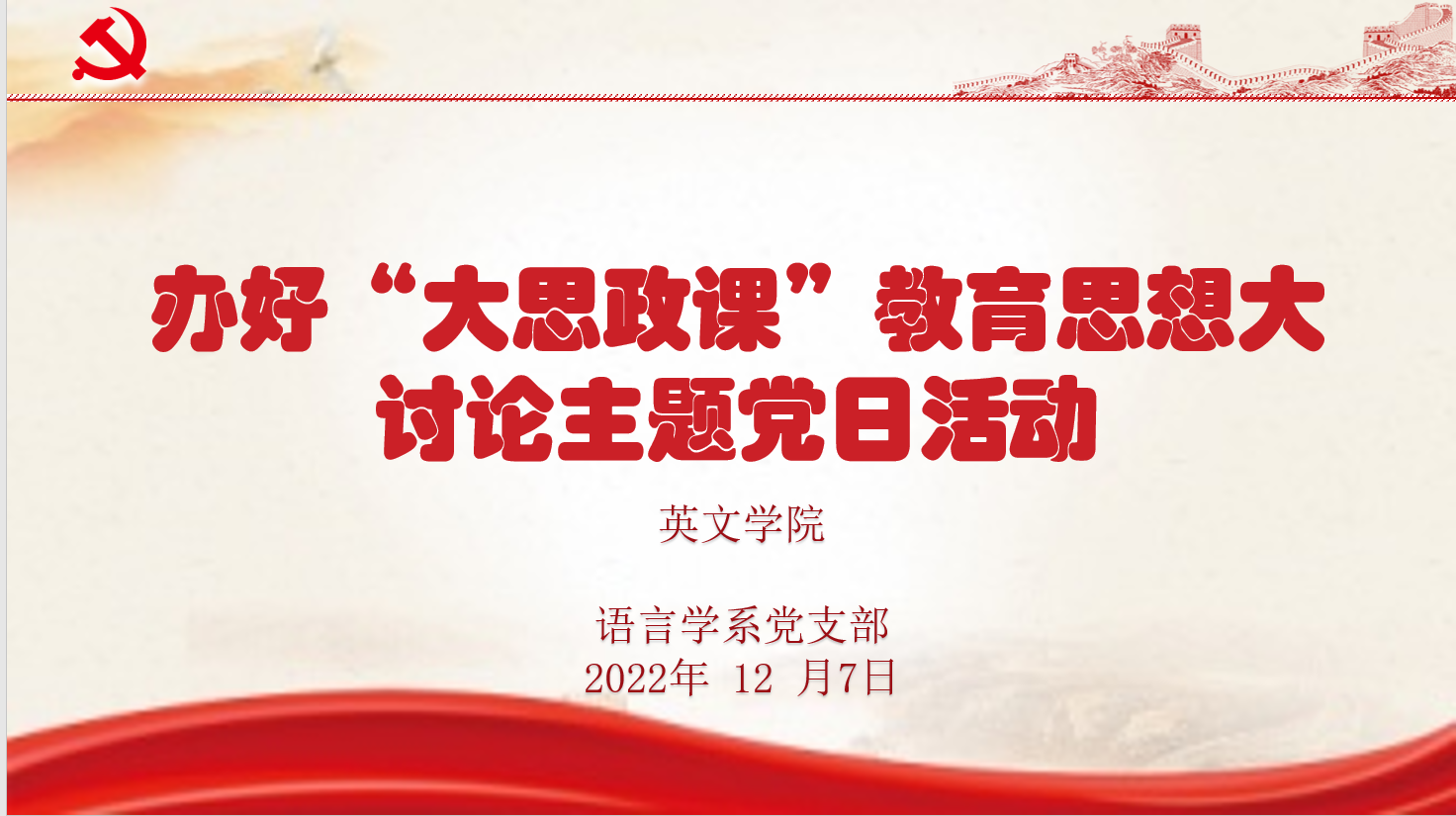 12月7日下午,英文学院国别与跨文化研究系(支部)、英语文学系(支部)、翻译系(支部)、语言学系(支部)、写作教研室(支部)与大学英语教研室(支部)通过线上的方式,组织开展了本学期第15周政治理论学习暨教育思想大讨论活动。