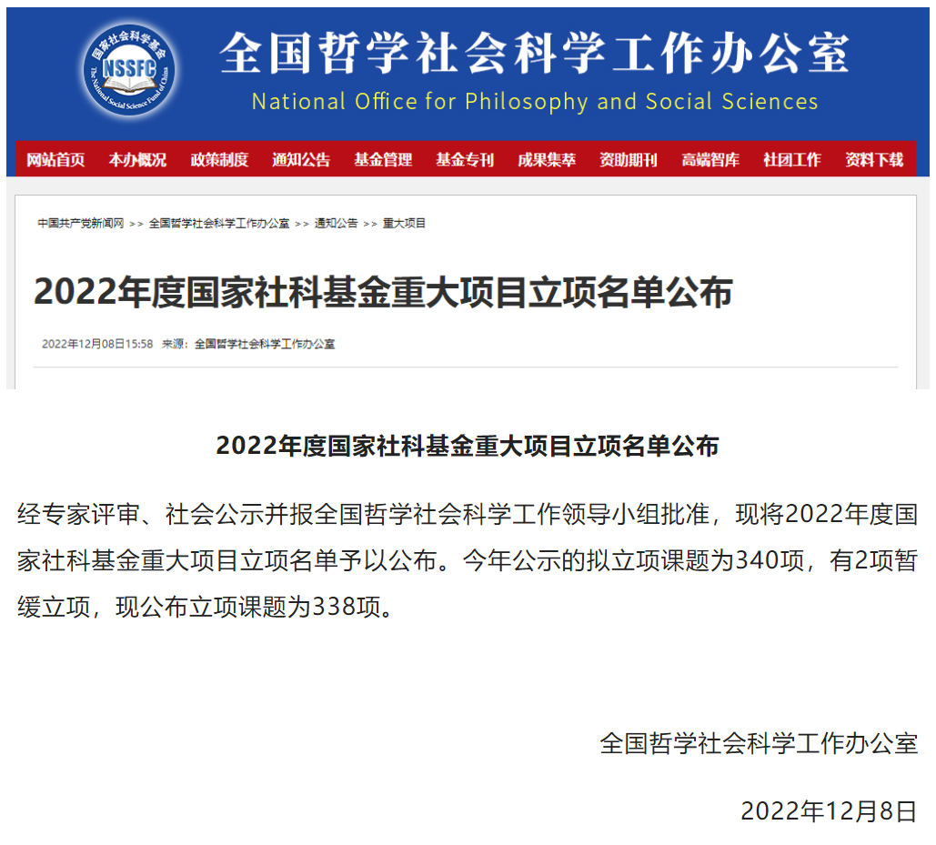 12月8日,全国哲学社会科学工作办公室发布了2022年度国家社会科学基金重大项目立项结果,我校新闻与传播学院赵战花教授主持的《百年中国新闻传播史著作整理及书写创新研究》项目获批立项,这是继去年我校首次获批国家社科基金重大项目之后再次获此立项。