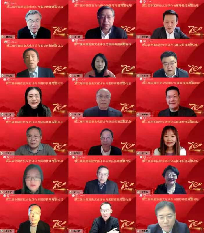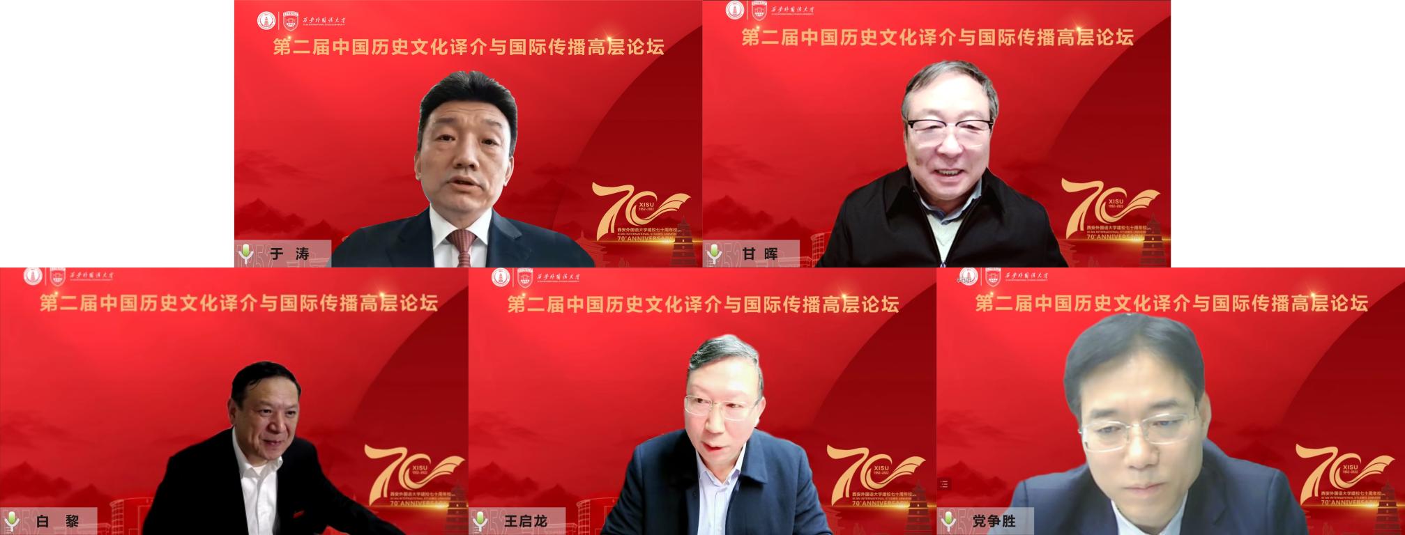 建校70周年校庆系列学术活动“第二届中国历史文化译介与国际传播高层论坛”于12月11日在线成功举行。本次活动由陕西省社会科学界联合会与我校联合主办。中国外文局副局长、全国翻译专业学位研究生教育指导委员会主任委员于涛,陕西省社会科学界联合会主席甘晖,我校党委书记白黎,副校长(主持行政工作)王启龙出席会议并致辞;中国翻译协会常务副会长、中国翻译研究院副院长、全国翻译教指委专家委员会主任黄友义译审,上海外国语大学党委书记、全国翻译教指委副主任委员姜锋研究员,湖南师范大学党委书记、中国译协常务副会长、教育部高等学校外国语言文学类专业教学指导委员会和全国翻译教指委副主任委员蒋洪新教授,全国政协常委、中国人民对外友好协会原副会长、教育部高等学校外语专业教学指导委员会法语分委员会副主任委员户思社教授,北京第二外国语学院党委常委、副院长、中国译协副会长程维教授,四川外国语大学校长、中国译协常务副会长、全国翻译教指委委员董洪川教授,北京大学党委副书记、国务院学位委员会第八届外语学科评议组秘书长宁琦教授,国务院学位委员会第六和第七届外国文学学科评议组召集人、浙江大学文科资深教授许钧,广东外语外贸大学原校长仲伟合教授,第七届国务院学位委员会外语学科评议组成员、北京外国语大学讲席教授王克非,国务院学位委员会外语学科评议组成员、上海交通大学特聘教授彭青龙,北京外国语大学高级翻译学院院长、全国翻译教指委副主任委员任文教授,南京大学翻译研究所所长、全国翻译教指委委员刘云虹教授,西南大学外国语学院院长、全国翻译教指委委员文旭教授,上海外国语大学高级翻译学院院长、全国翻译教指委秘书长张爱玲教授,广东外语外贸大学翻译学研究中心主任、全国翻译教指委副主任委员赵军峰教授,中国海洋大学外国语学院院长、全国翻译教指委委员杨连瑞教授等17位知名专家学者作主旨发言。兄弟院校部分专家学者及我校师生代表等400余人在线参加会议。