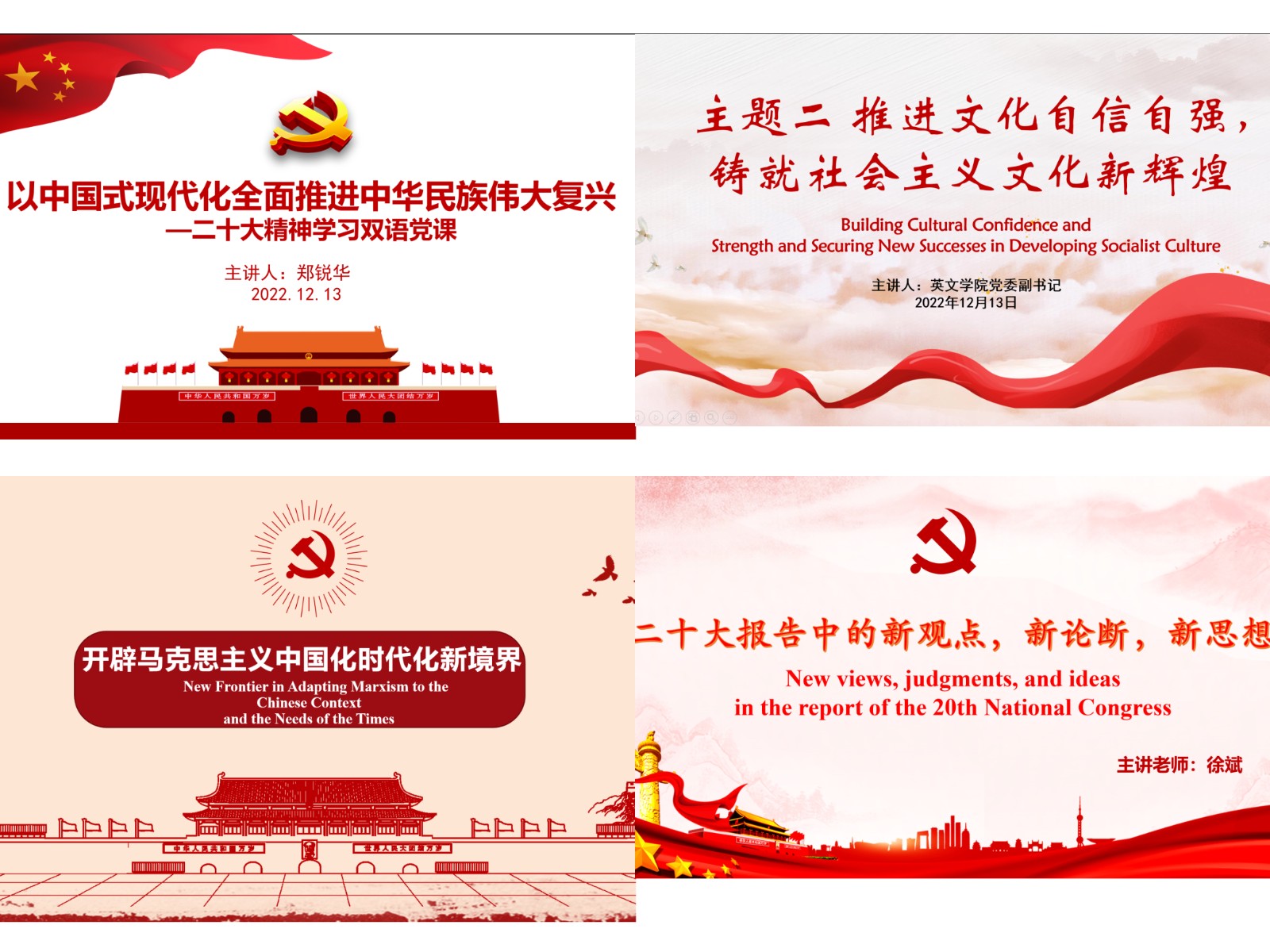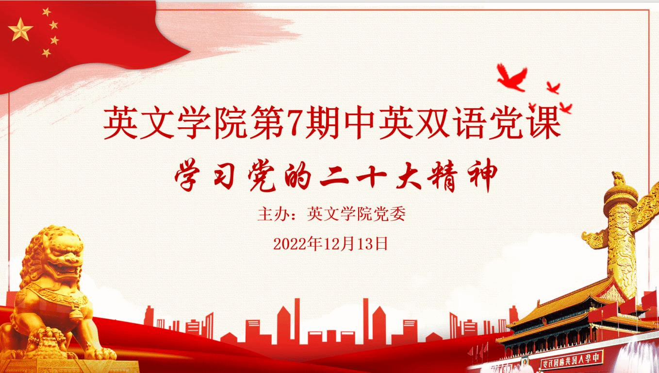 为深入学习贯彻党的二十大精神,扎实推进党员的党性教育和专业教育,英文学院党委结合英语专业特色,于12月中旬举办第7期“学习党的二十大精神”中英双语党课。本期党课采取线上教学方式,围绕党的二十大报告进行阐释和讲解,学院共计300余名学生党员参加。