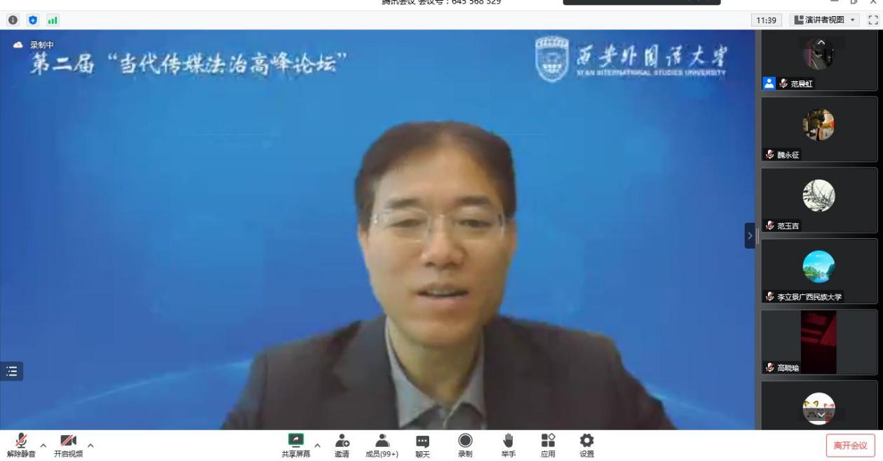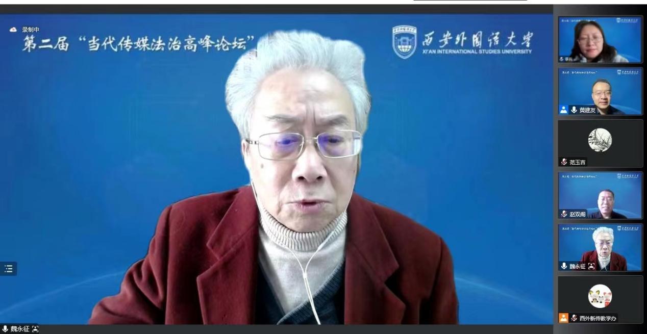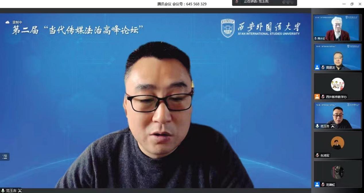 为深入学习贯彻党的二十大精神,推动国家传媒法治建设,12月17日,国际视野与本土特色——第二届“当代传媒法治高峰论坛”在我校举行。副校长党争胜教授致欢迎词,联办单位代表、华东政法大学传播学院院长范玉吉教授致辞,论坛总顾问、著名传播法学家魏永征先生做主题演讲,新闻与传播学院院长黄建友主持开幕式。来自全国50多所高校近300名传媒法专家学者和青年学子在云端齐聚一堂,共襄盛会。