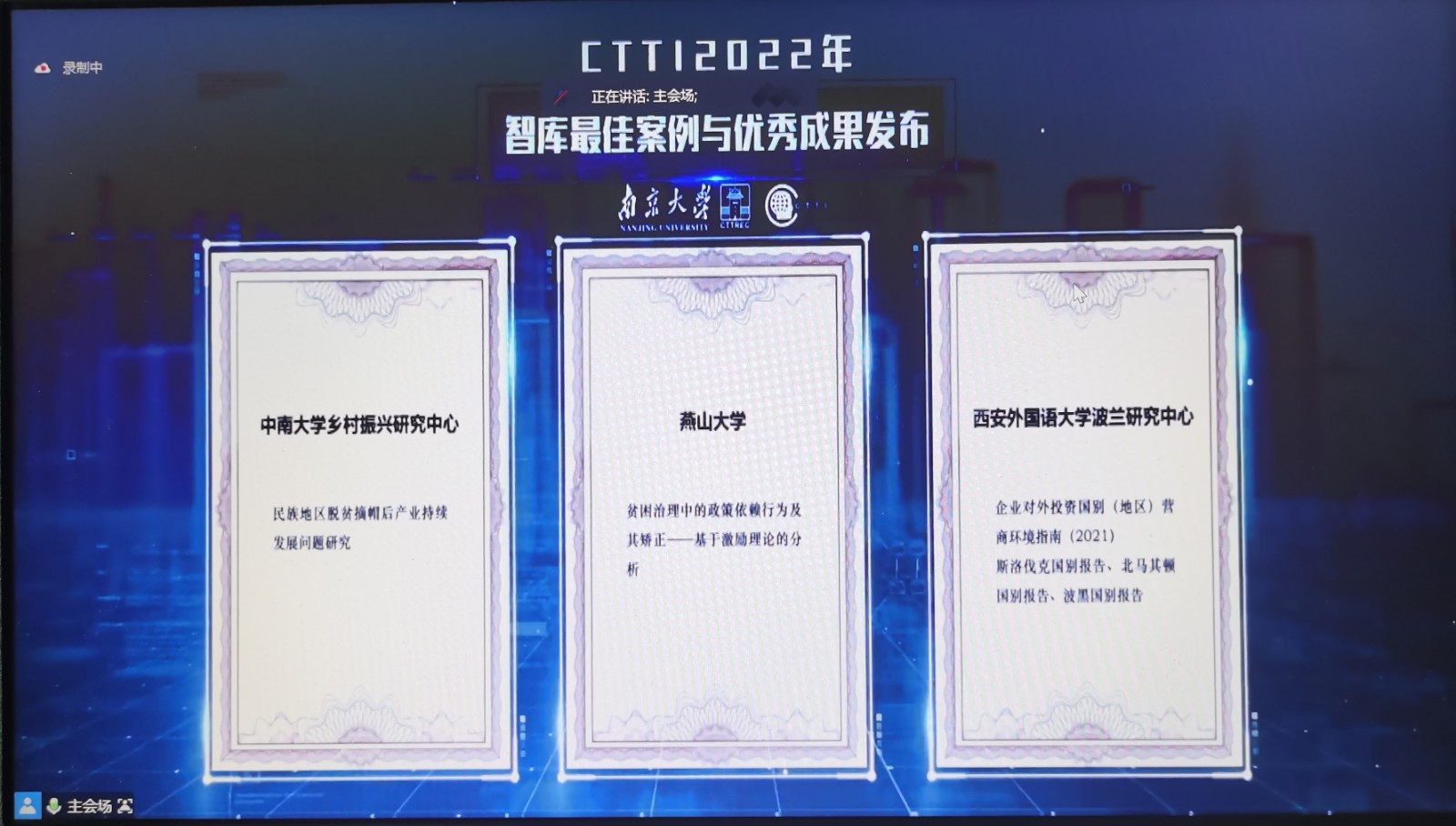 此次论坛发布了CTTI2022年度增补来源智库86家,入选率46%。南亚研究中心是继波兰研究中心、东北亚研究中心、国际舆情与国际传播研究院后,我校第四个入选的智库。论坛还发布了一批智库最佳案例和优秀成果,我校波兰研究中心报送的《企业对外投资国别(地区)营商环境指南(斯洛伐克国别报告、北马其顿国别报告、波黑国别报告)2021》三卷本获得CTTI2022年度智库最佳案例与优秀成果二等奖,系我校首次获此殊荣。