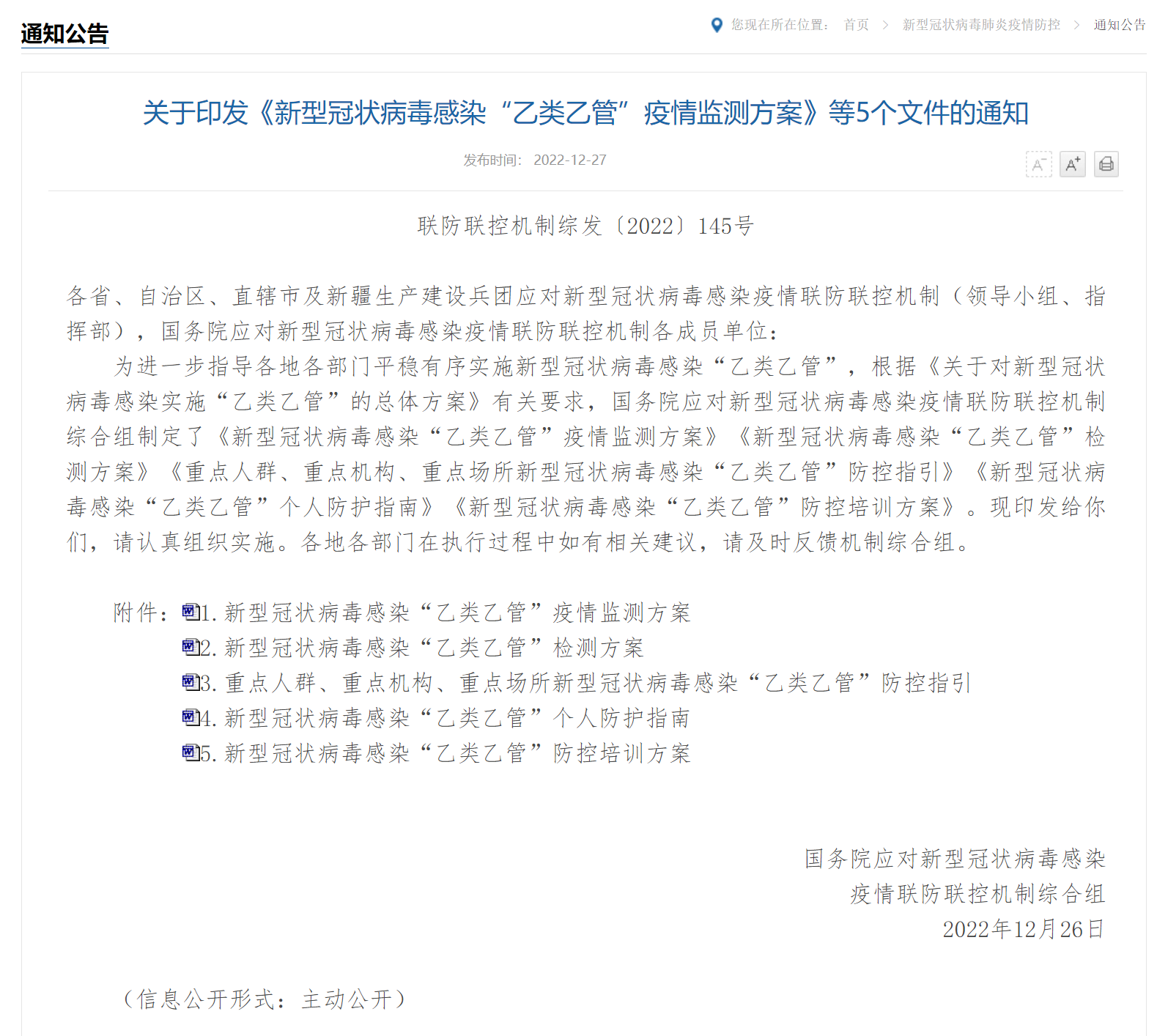 为进一步指导各地各部门平稳有序实施新型冠状病毒感染“乙类乙管”,根据《关于对新型冠状病毒感染实施“乙类乙管”的总体方案》有关要求,国务院应对新型冠状病毒感染疫情联防联控机制综合组制定了《新型冠状病毒感染“乙类乙管”疫情监测方案》《新型冠状病毒感染“乙类乙管”检测方案》《重点人群、重点机构、重点场所新型冠状病毒感染“乙类乙管”防控指引》《新型冠状病毒感染“乙类乙管”个人防护指南》《新型冠状病毒感染“乙类乙管”防控培训方案》。现印发给你们,请认真组织实施。各地各部门在执行过程中如有相关建议,请及时反馈机制综合组。