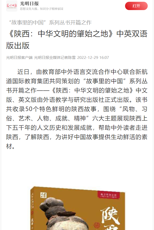 《陕西:中华文明的肇始之地》的出版得到了各界高度关注。在近日举行的国际中文教育大会上,该书作为外语教学与研究出版社打造的精品资源进行了重点展示。下一步,“故事里的中国”系列丛书将陆续推出更多地方分卷,通过深入挖掘各个省级行政区的人文故事,充分展现中华文化和而不同的多样化生态,让读者在一个个生动的故事中领略中国的多姿多彩。