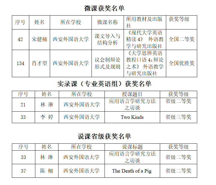 近日,第七届全国高等院校英语教师教学基本功大赛比赛结果揭晓,我校英文学院教师宋健楠获得微课全国二等奖,肖才望获得全国优胜奖;林琳获得实录课(专业英语组)省级二等奖,李婷获得省级三等奖;林琳获得说课省级二等奖,外国语言文学研究院教师陈栩获得省级二等奖。