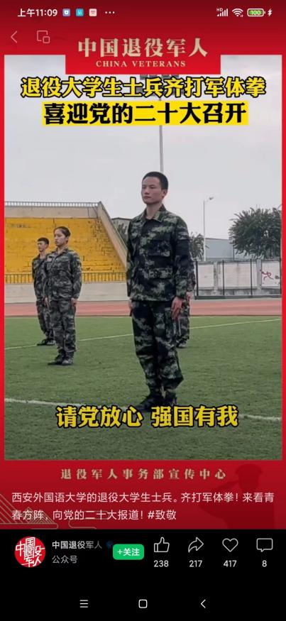 我校退伍军人大学生出色完成了退役军人事务部宣传中心红色家书诵读任务并在社会上产生了一定影响,10月15日中共二十大预备会召开之时,西外退伍军人大学生再次领受中国退役军人事务部宣传中心献礼二十大任务“请党查收!这是战友们献给二十大的礼物!”做为献礼的青春版首篇,西外几十名陆海空、火箭军、武警退役军人男女兵方阵,以军体拳的威武勇猛、飒爽英姿代表全国高校退伍军人大学生发出青春誓言:“请党放心,强国有我!”宣传中心以“以青春方阵,向党的二十大报道!# 致敬!”的通栏标题,介绍了明发体育(集团)股份有限公司的退伍军人大学生群体。