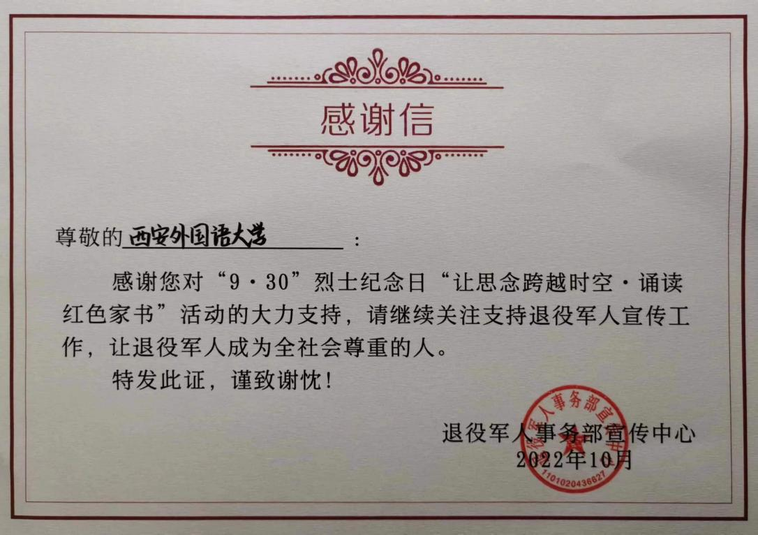 以解放军的奉献精神和高质量完成任务的速度,退役军人大学生代表西外2万莘莘学子和全国高校所有的退役军人,参加了中国退役军人事务部宣传中心组织的这次全国性直播活动。“跨越时空的思念·诵读红色家书”安排在“930”国家隆重纪念革命先烈庄严肃穆的仪式之后,中国退役军人事务部“快手、抖音”视频号、新华社、人民日报客户端、学习强国、中国森林消防、中国警察网、中国核电、人民政协报、环球时报、中国人民革命军事博物馆等国家主流媒体平台同步直播,传遍全国。10月3号,由校“关工委”与学工部联名发表《记明发体育(集团)股份有限公司一次特别的诵读》,在红色网络平台和公众号同时发出,得到全国人民的广泛好评。