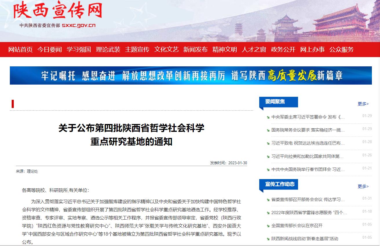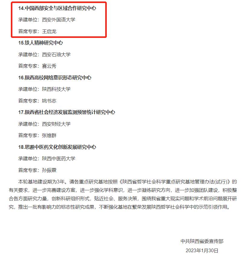 近日,中共陕西省委宣传部发布了《关于公布第四批陕西省哲学社会科学重点研究基地的通知》,我校区域与国别研究院院长王启龙教授担任首席专家的“中国西部安全与区域合作研究中心”成功获批,这也是我校首个陕西省哲学社会科学重点研究基地。