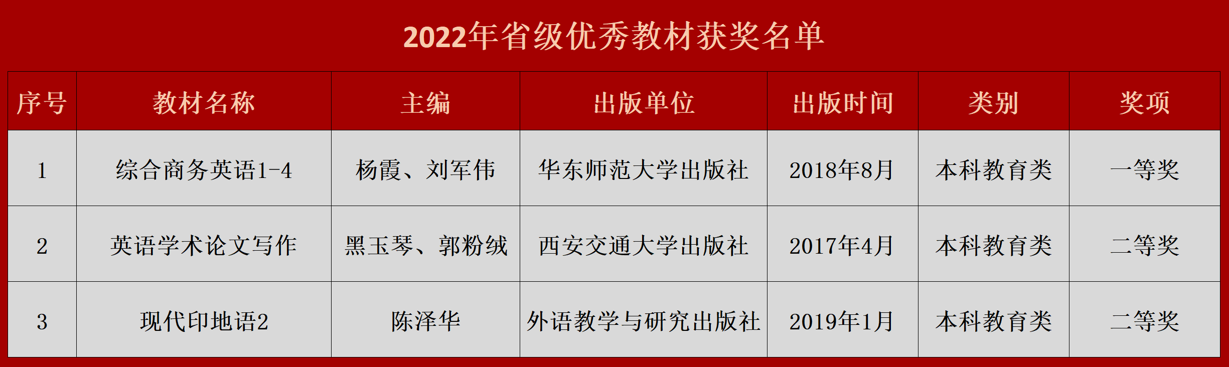 近日,陕西省教育厅办公室公布了陕西省2022年职业教育和高等教育优秀教材奖名单,我校杨霞教授、刘军伟教授主编的《综合商务英语1-4》荣获省级优秀教材一等奖,黑玉琴教授、郭粉绒副教授主编的《英语学术论文写作》、陈泽华副教授主编的《现代印地语2》荣获省级优秀教材二等奖。