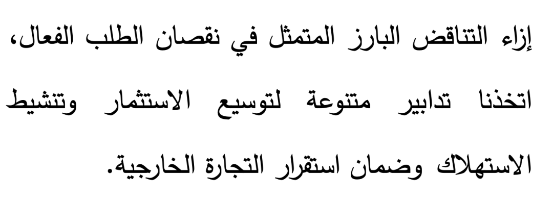 俄:Для преодоления острого противоречия, связанного с недостаточностью эффективного спроса, мы предприняли комплекс мер, направленных на увеличение инвестиций, стимулирование потребления и стабилизацию внешней торговли.