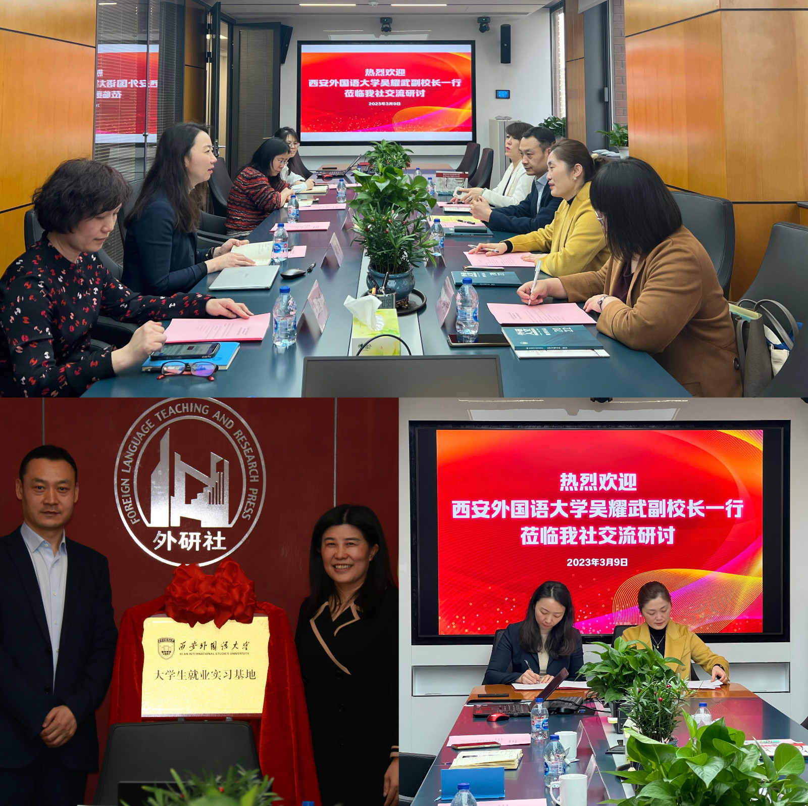 3月9日下午,吴耀武一行走访外研社,与外研集团党委书记、董事长、外研社社长王芳,中国语言文化出版分社社长鞠慧等人座谈交流。吴耀武简述了我校的历史沿革及国际化人才培养成效;鞠慧细数了外研社与我校合作的代表性成果;樊花汇报了学院围绕助力延安红色文化“走出去”所做的探索性尝试。随后,王芳、吴耀武为就业实习基地揭牌,鞠慧、樊花分别代表双方签署合作协议。双方一致同意,将围绕多语种讲好中国故事、人文社科著作海内外出版及数字化发行、集教测评研为一体的教材研发及课题联合攻关、师生培训及学生就业实习等领域谱新篇、结硕果。