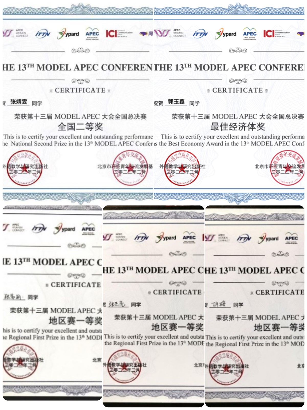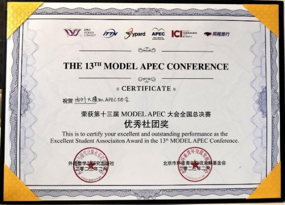 经过前期XISU MODEL APEC初赛、复赛、决赛层层选拔,最终我校共选派6名学生参加全国总决赛,并取得优异的成绩。其中,英文学院2020级张婧雯凭借充分准备和出色发挥斩获“全国二等奖”;英文学院2019级郭玉鑫荣获“最佳经济体奖”;英文学院2019级张家丽、2020级张杰亮、2020级胡榕、高级翻译学院2019级潘娅婷荣获新设奖项“地区赛一等奖”。我校荣获“优秀组织高校奖”,西外大模拟APEC协会荣获“优秀社团奖”。