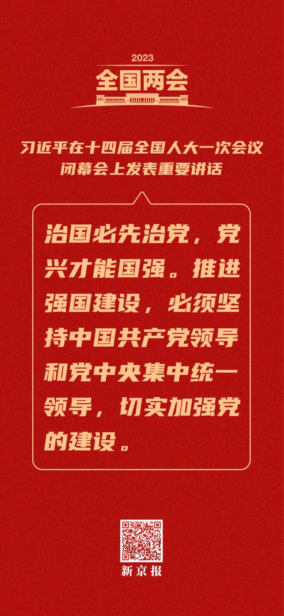 习近平说,治国必先治党,党兴才能国强。推进强国建设,必须坚持中国共产党领导和党中央集中统一领导,切实加强党的建设。要时刻保持解决大党独有难题的清醒和坚定,勇于自我革命,一刻不停全面从严治党,坚定不移反对腐败,始终保持党的团结统一,确保党永远不变质、不变色、不变味,为强国建设、民族复兴提供坚强保证。