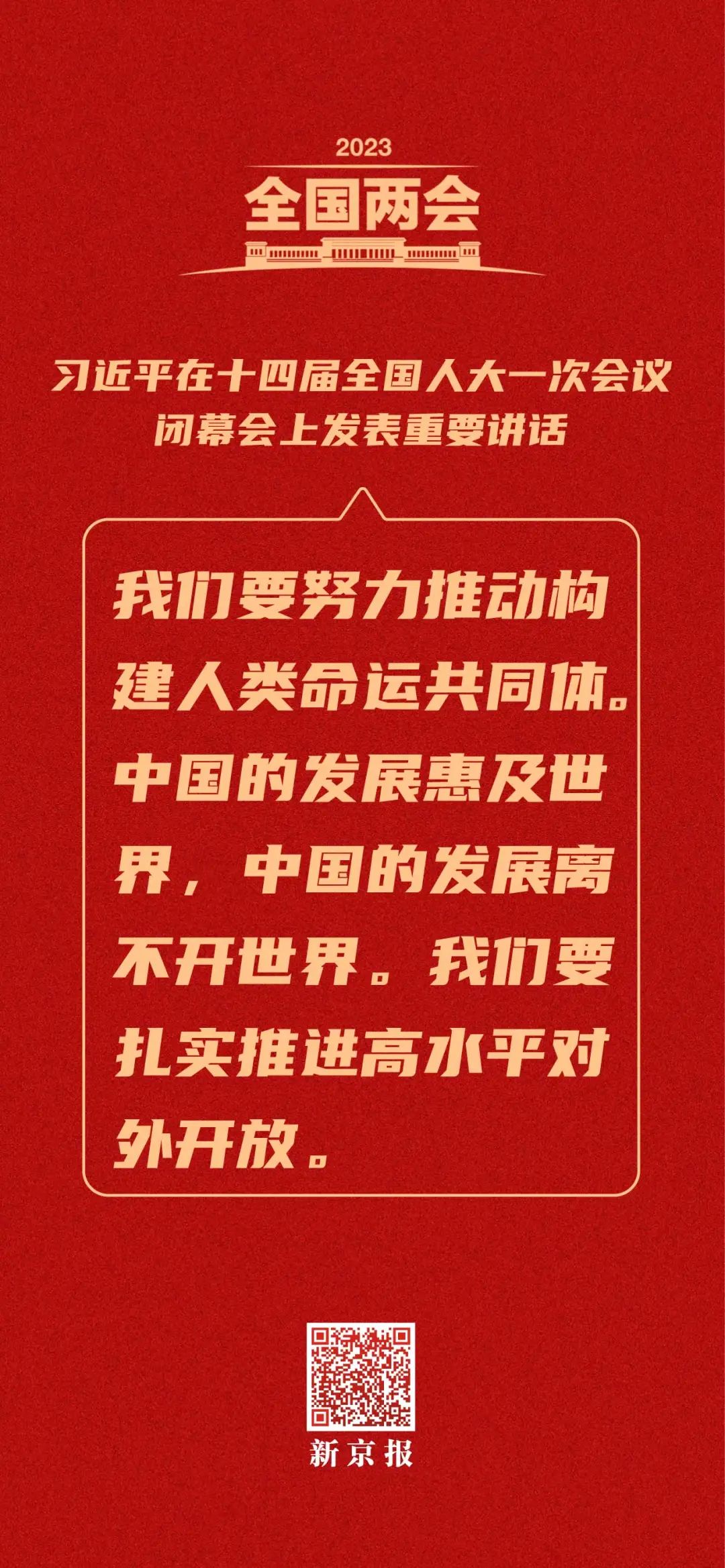 习近平说,我们要努力推动构建人类命运共同体。中国的发展惠及世界,中国的发展离不开世界。我们要扎实推进高水平对外开放,既用好全球市场和资源发展自己,又推动世界共同发展。我们要高举和平、发展、合作、共赢旗帜,始终站在历史正确一边,践行真正的多边主义,践行全人类共同价值,积极参与全球治理体系改革和建设,推动建设开放型世界经济,推动落实全球发展倡议、全球安全倡议,为世界和平发展增加更多稳定性和正能量,为我国发展营造良好国际环境。